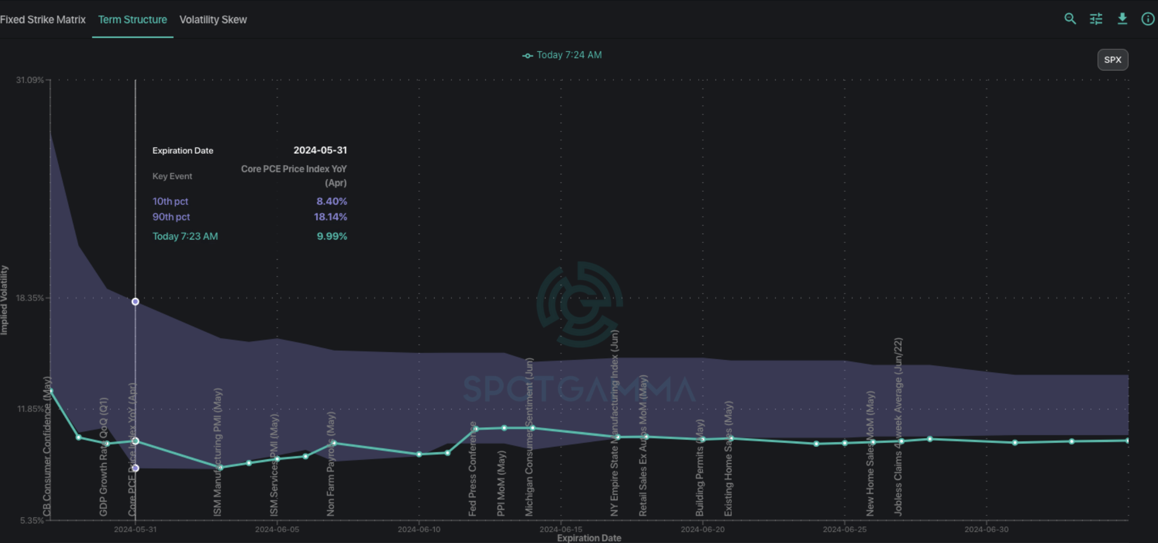 You can see there is a small bump in IV’s for the 5/31 Core PCE on Friday, and then the following week (first week of June) we see ISM data + NonFarms, which then feeds into 6/10 FOMC.