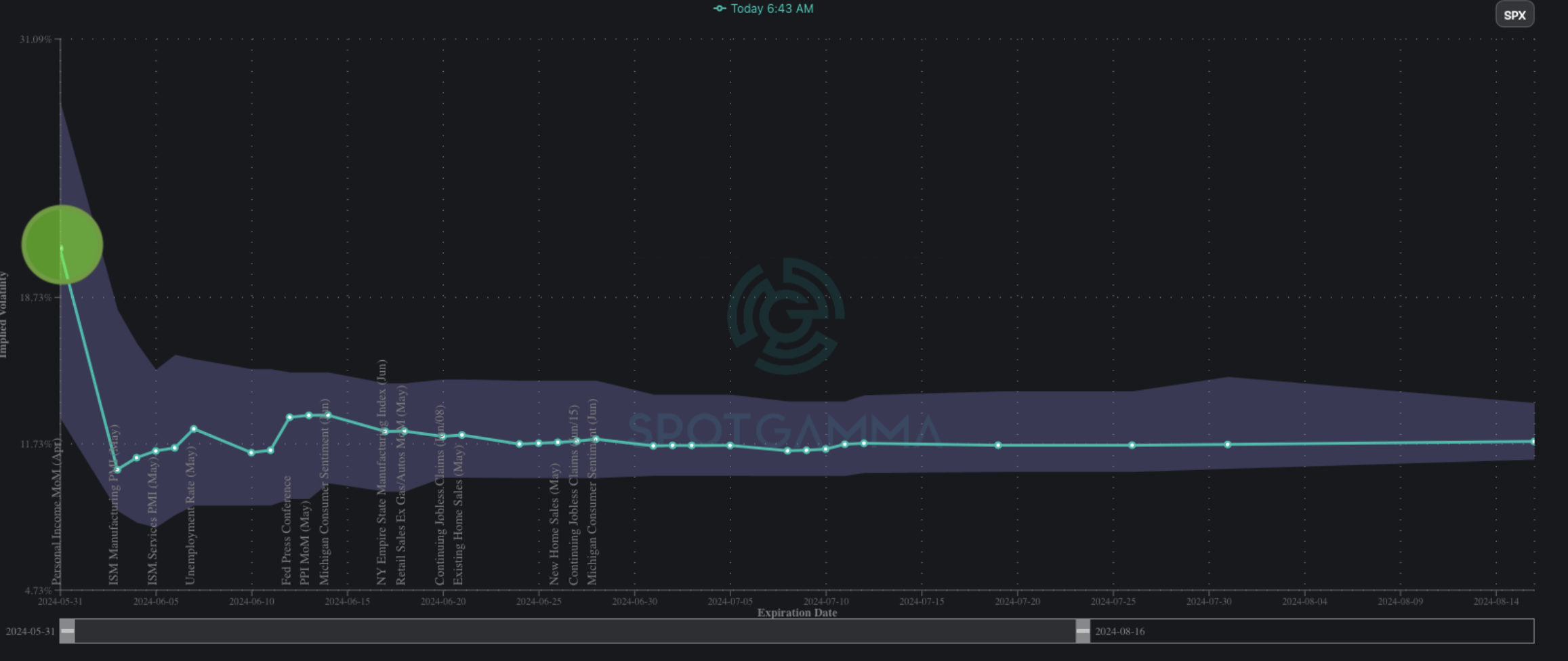You can see the elevated 0DTE IV, below. While this is certainly elevated, its very far from panicked. On this point the 0DTE straddle is priced at a meager $29 or 55bps (ref 5,230, IV 20%). You may recall last week that the 0DTE straddle was amazingly low at $17/32 bps – so comparatively today is “rich”. The reality is this is the market doesn’t really care that much about PCE.