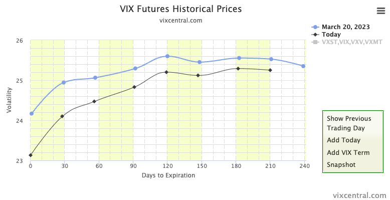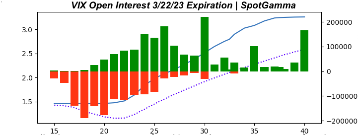 Here is the updated VIX open interest for 3/22, with the largest call interest holding >=24. We continue to think traders are incentivized to keep the VIX under this level into tomorrow AM’s OPEX.