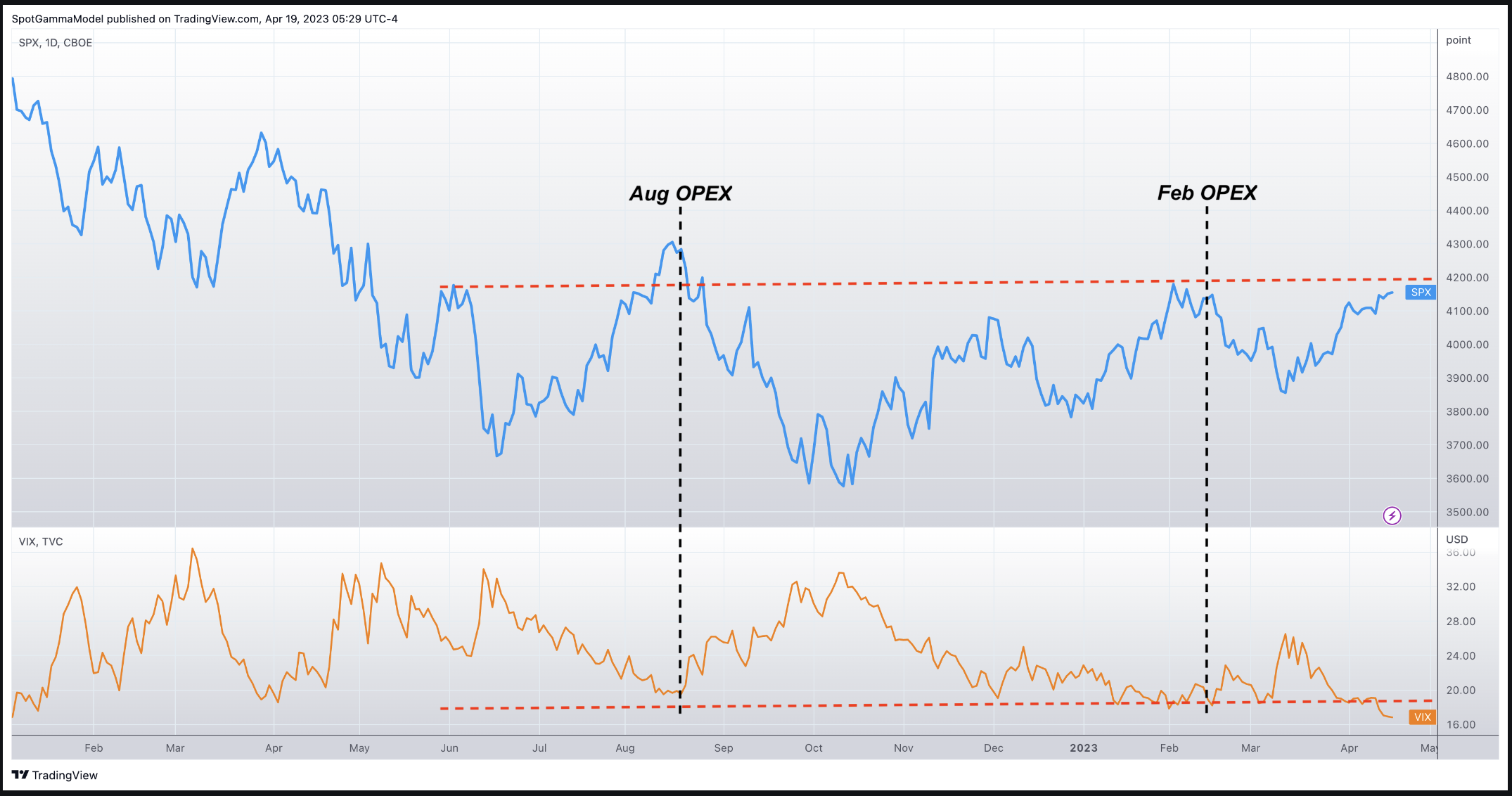 Both August ’22 and Feb ’23 expirations marked equity highs and volatility lows, as you can see below (SPX top, VIX bottom). While there was just some initial consolidation following those expirations (which is our base case for this exp), there were major catalysts to drive equity prices lower 1-2 weeks after those dates. In August is was Jackson Hole, and after February it was SVB.