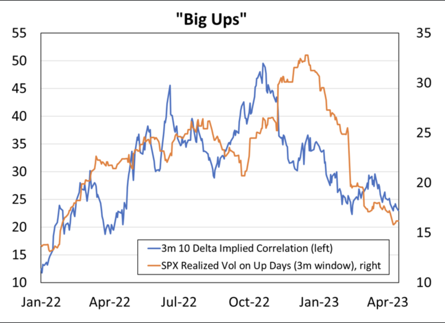 As equities have been up strongly YTD, there is now less upside volatility – rallies seem to have “less punch”. We think this is an important dynamic to consider moving forward, as it implies that traders may now have more time to catch up to market rallies, whereas last year it often felt there was a penalty to not having enough upside exposure.