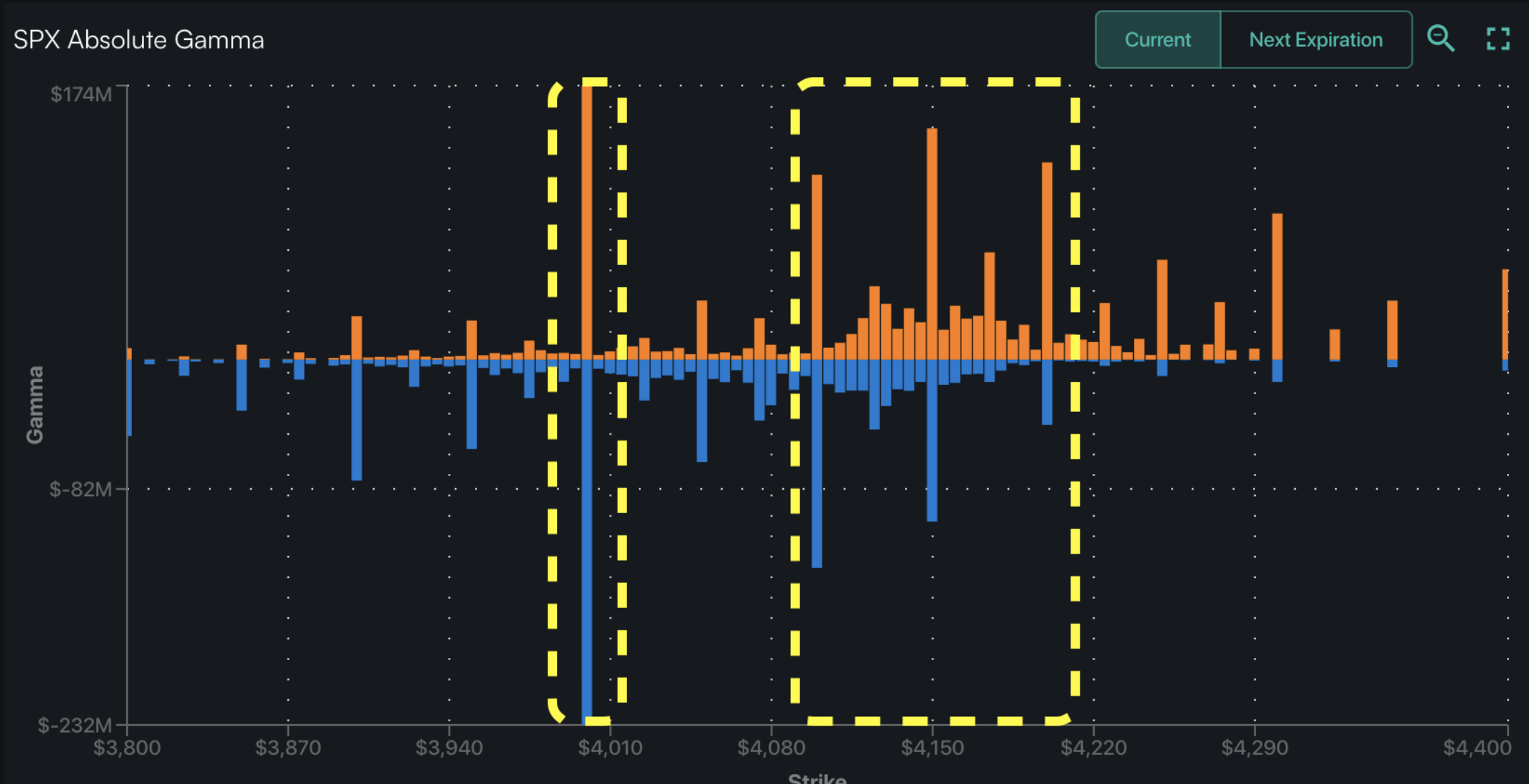 Macro focus for this week will be on earnings, and turning to the FOMC on 5/3. From the options side, we have been of the view that this post-OPEX week could face some market consolidation, and a bounce in implied volatility. As you can see in the plot of gamma by strike below, the key ATM/upside resistance range remains the 4100/4150/4200 area, then there is a large gap down to the large 4000 strike.
