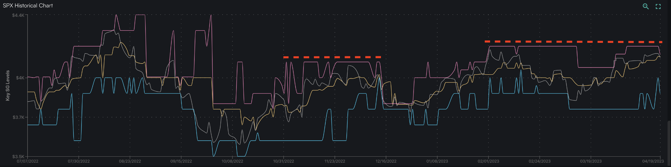 Over the past six months the 4100-4150 price range is where momentum has been consistently lost. Related to this, our Call Walls have consistently stalled in this 4100-4150 range, which we think says something about demand for S&P upside. This can be seen in the plot below, wherein the Call Walls (pink) stay unchanged despite the SPX (gray) testing the Call Wall (dashed red lines). Call Walls shift higher when calls are rolled up to higher strikes, and so we think it says something about demand when these levels are stationary despite higher SPX prices. Looking forward, should the Call Walls roll higher, then we think that unlocks upside SPX potential.