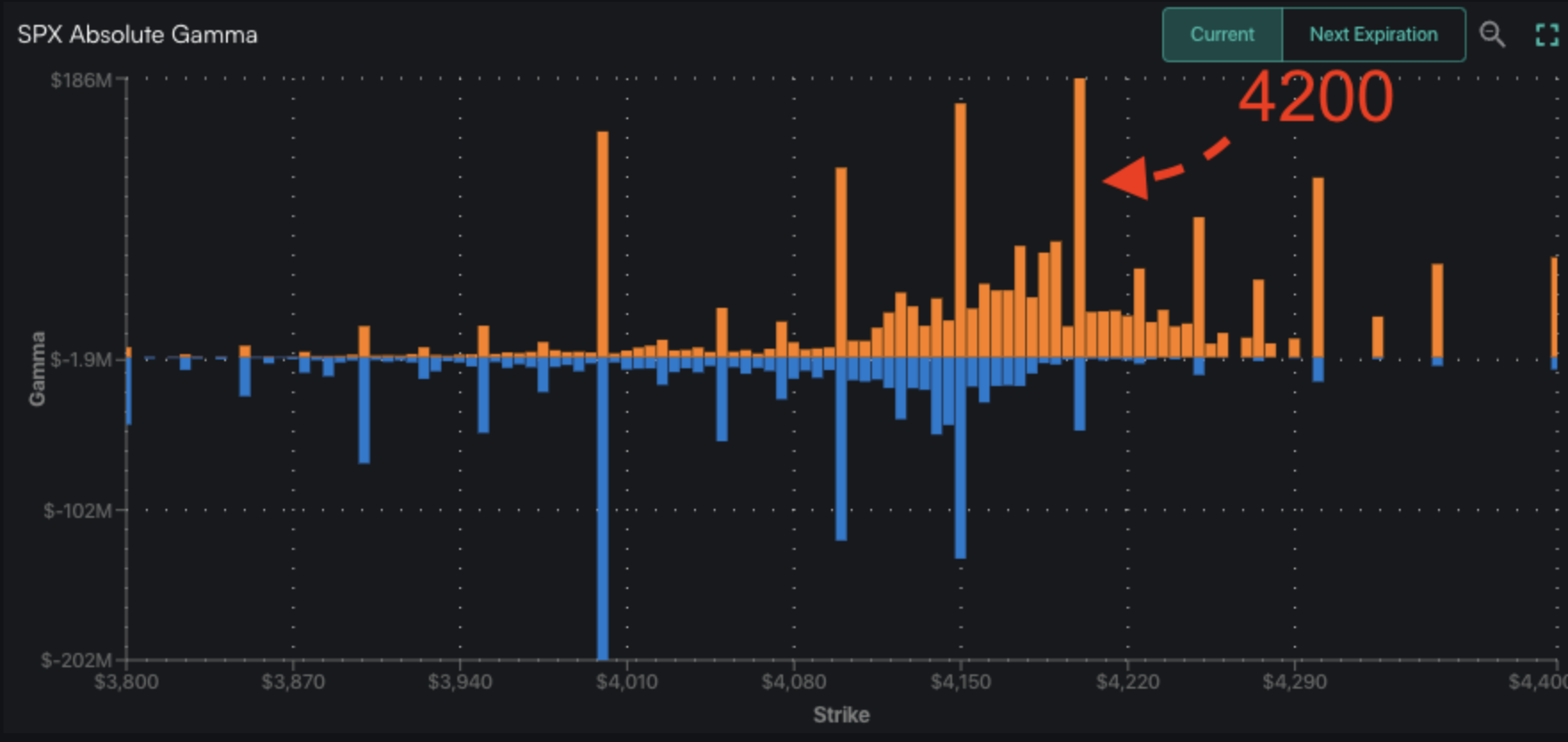 There was a solid build to call positions on Friday, which led to an increase in gamma at the 4200 Call Wall. As discussed in Fridays note, we think the close above 4150 invokes an S&P test of this large 4200 level. The 4200 Call Wall is also currently our max market high, and that remains until/unless the Call Wall rolls to a higher strike. As you can see below, both 4250 & 4300 are gaining in size (call gamma, orange), and with a neutral to bullish FOMC we may see the Wall roll higher to one of those strikes.