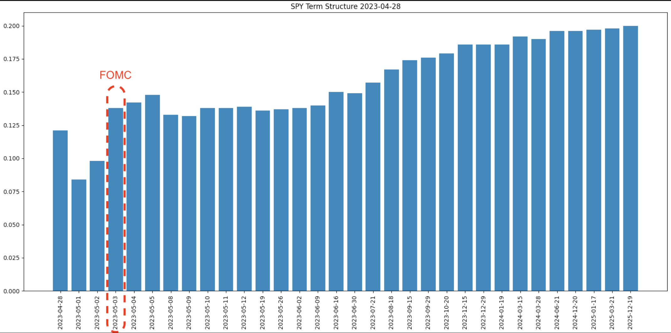 Shown below is the steep contango of SPY term structure, with a lowly 14% (!) IV assigned to 5/3 FOMC day. We have discussed this in the past, but it is rather remarkable how low IV is for not only FOMC, but all of the other major datapoints (ex: CPI, non farms) which used to draw elevated IV’s. From a sentiment perspective, this is a shift from “this datapoint/statement determines our destiny” to “just don’t give me a tail print”.