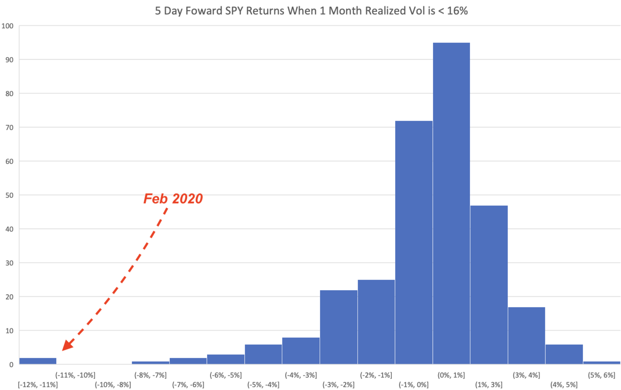 The histogram below plots the forward 5 day returns, and as you can see the returns tend to be positive, with some nasty left tails. Often times these periods of calm can be a bit head scratching, leaving traders to question the sanity of market bulls. This is something like a game of musical chairs, wherein you want to be long equities only until the music stops/IV pops. A prime example of this was in Feb ’20 when the news was dominated by the surge in Covid, but equities were calmly rising to all time highs. Then, suddenly (right on Feb OPEX), markets turned violently lower.