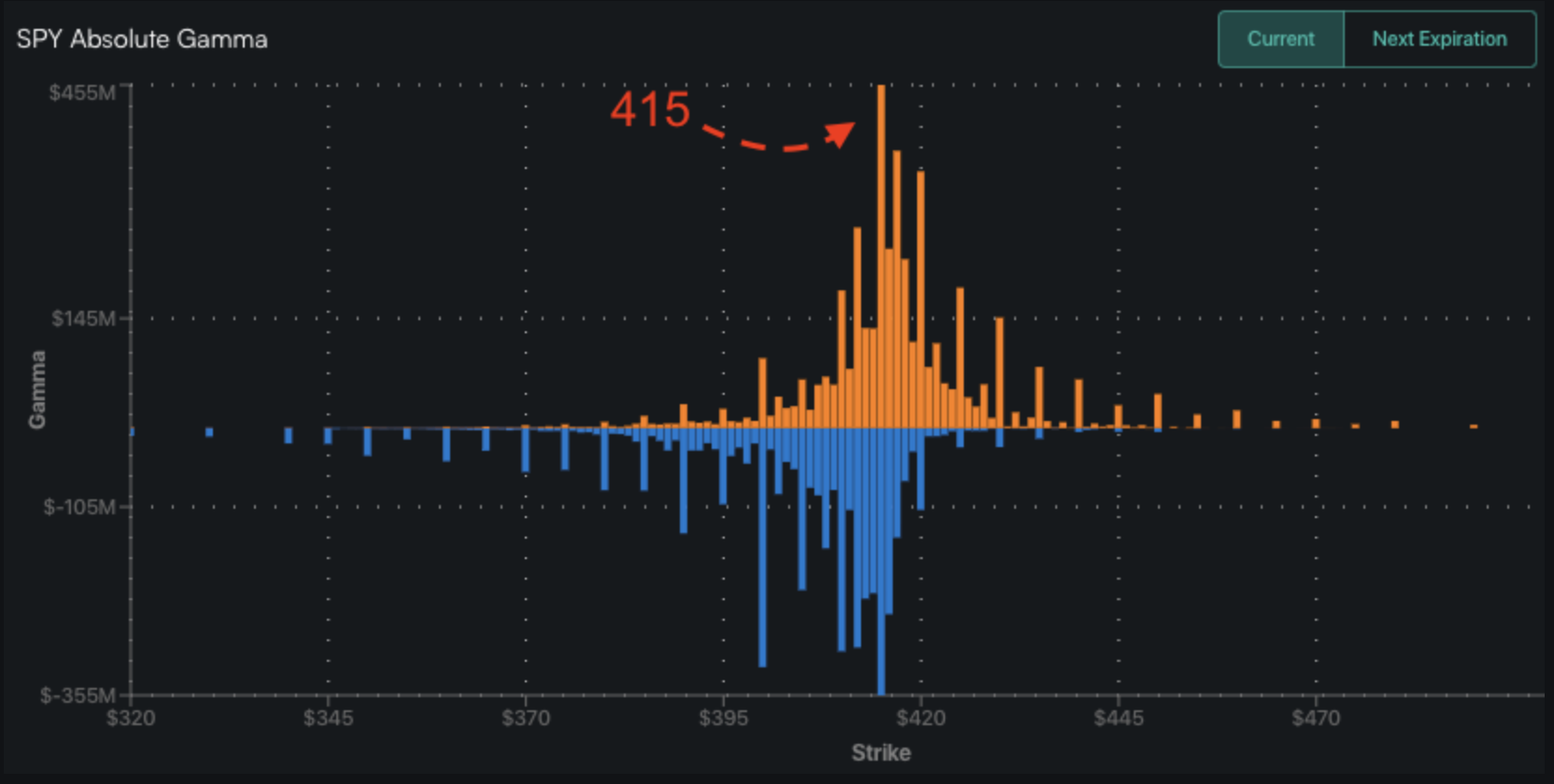 Turning back towards the short term, SPY 415 (SPX 416) is a very large gamma strike, and the market has been mean reverting to it over the last 2 sessions (SPY $415 pre-market). No large piece of this expires in the near term, and so it likely remains in play for the next 1-2 sessions.