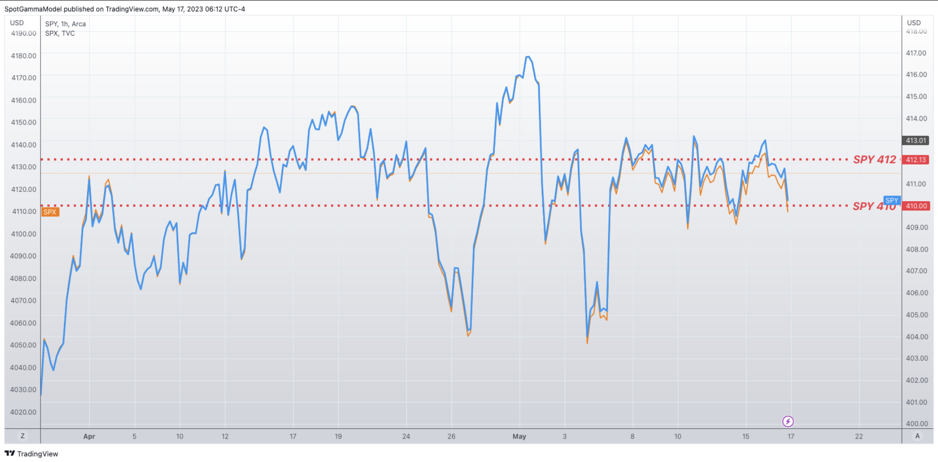 The two levels which we think have been really containing things since March have been SPY 410 & 412, which are highlighted below. Between today and Friday we estimate 30% of total open interest at these strikes to expire, which should reduce the forces pinning the S&P down.