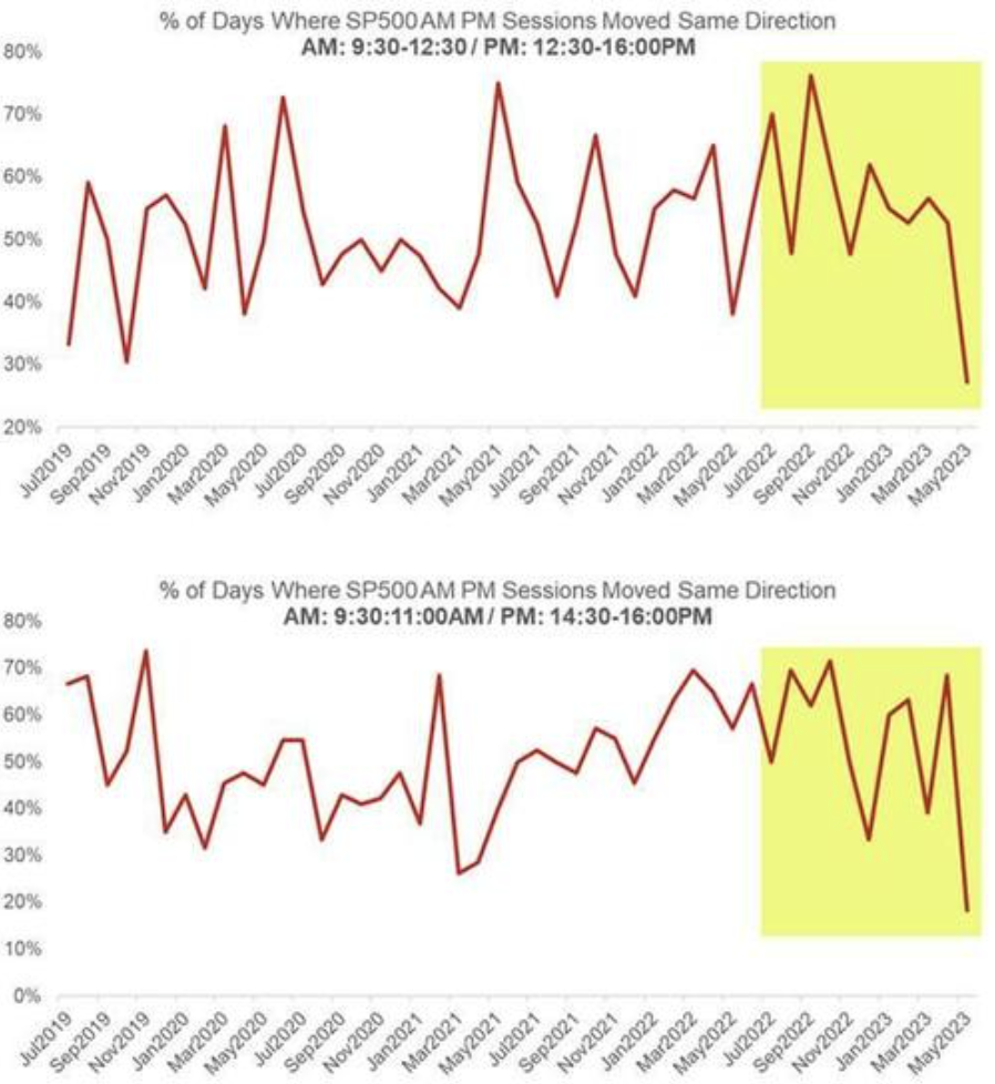 The one period of major volatility was during the March banking crisis, and we noted that 0DTE seemed to subside vs longer dated tail hedging flow. That being said, it is interesting to note that the March daily ranges (above) seemed fairly muted given the VIX hit 5 month highs. We’ve also seen evidence of what seems like traders using 0DTE to hedge out large market moves (i.e. buying 0DTE calls after large gaps lower), which arguably suppresses volatility – just on a different scale. Applying this to today’s markets, traders may want to be aware of the propensity for intraday bounces, even if there is a strong day-to-day trend.