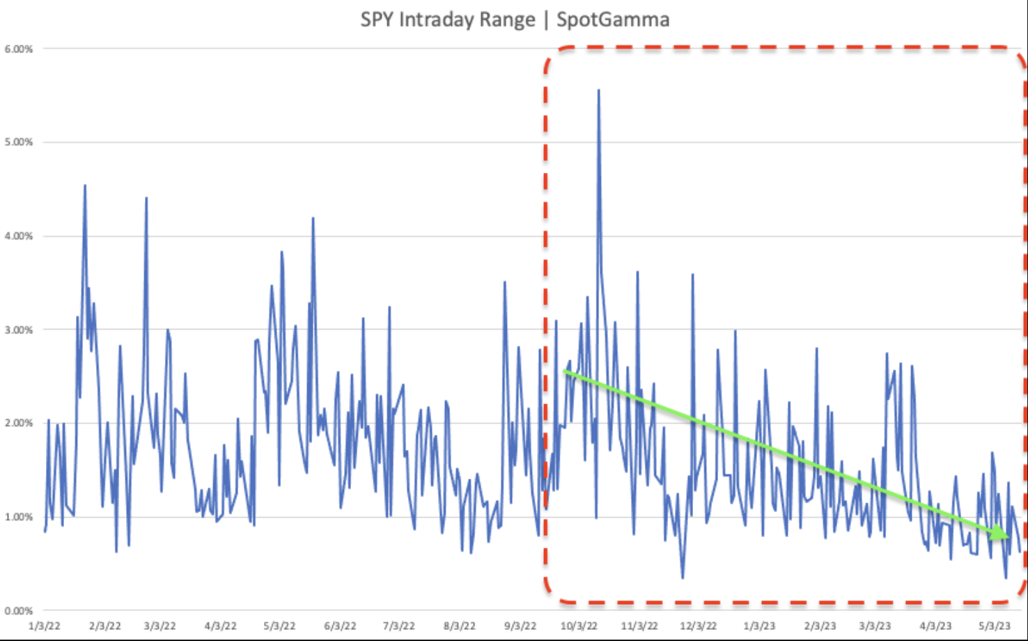 To this point, the chart below shows the intraday trading range for SPY (SPX high-low vs open), and as you can see its been a very strong trend toward tighter ranges since 0DTE was launched. As noted above this period also marked major October equity lows, after which stocks have performed very well. There is certainly correlation, but its hard to certify causation.