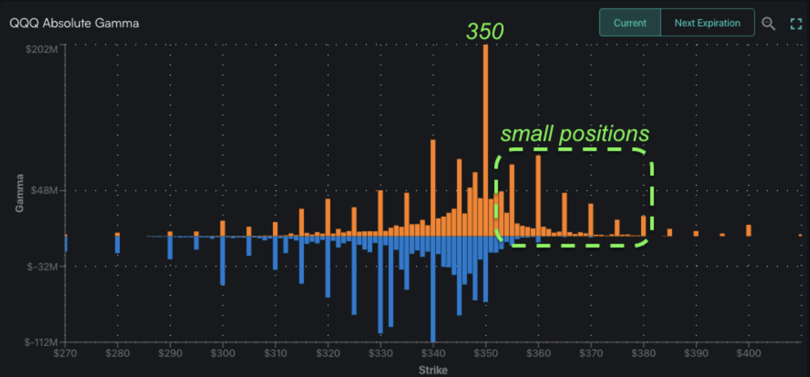 We also note C3 earnings (ticker AI), which have the stock down 21% premarket. This may lead to some further relative consolidation in tech, particularly given the elevated IV’s. Further, as you can see below, there are small positions >350 which suggest traders are not adding calls (orange) to strikes above. Calls added above serve to push the Call Wall higher, which we generally read as a bullish indication.