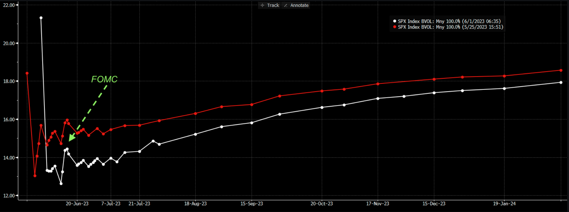 Back to S&P, with that Debt Ceiling drama apparently ending, traders attention likely turns to June 14th FOMC. The market is responding to this in kind, with IV’s pressing materially lower. 1 month realized S&P vol is down at 14%, and so the implied spread to realized is once again gone. You can see this reflected in pre-FOMC IV’s, which are all <=14%.