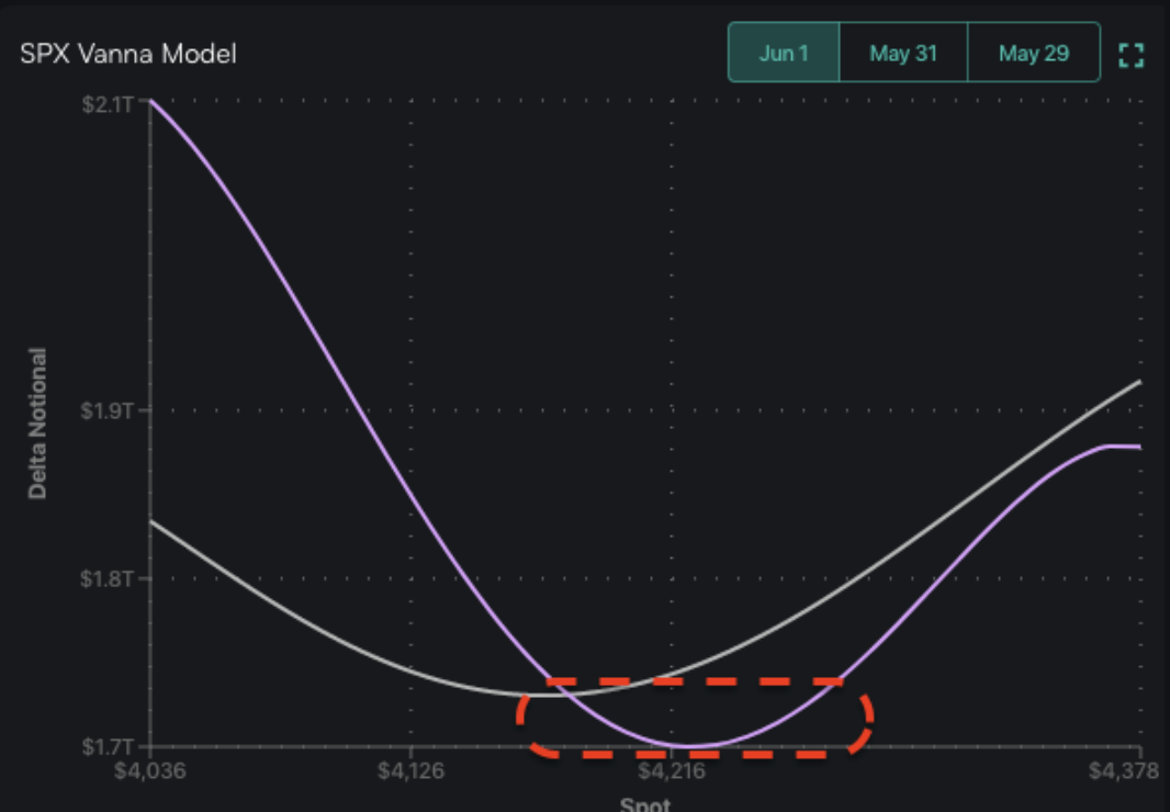 Given this (or despite the small spread), our vanna model shows that a reduction in IV may still help to provide a bit of a lift for equities. This is seen through the IV-adjusted delta notional (purple) being under that of standard delta’s (grey). We’d anticipate this vanna tailwind to die off should the S&P push into 4,230 (SPY Call Wall).