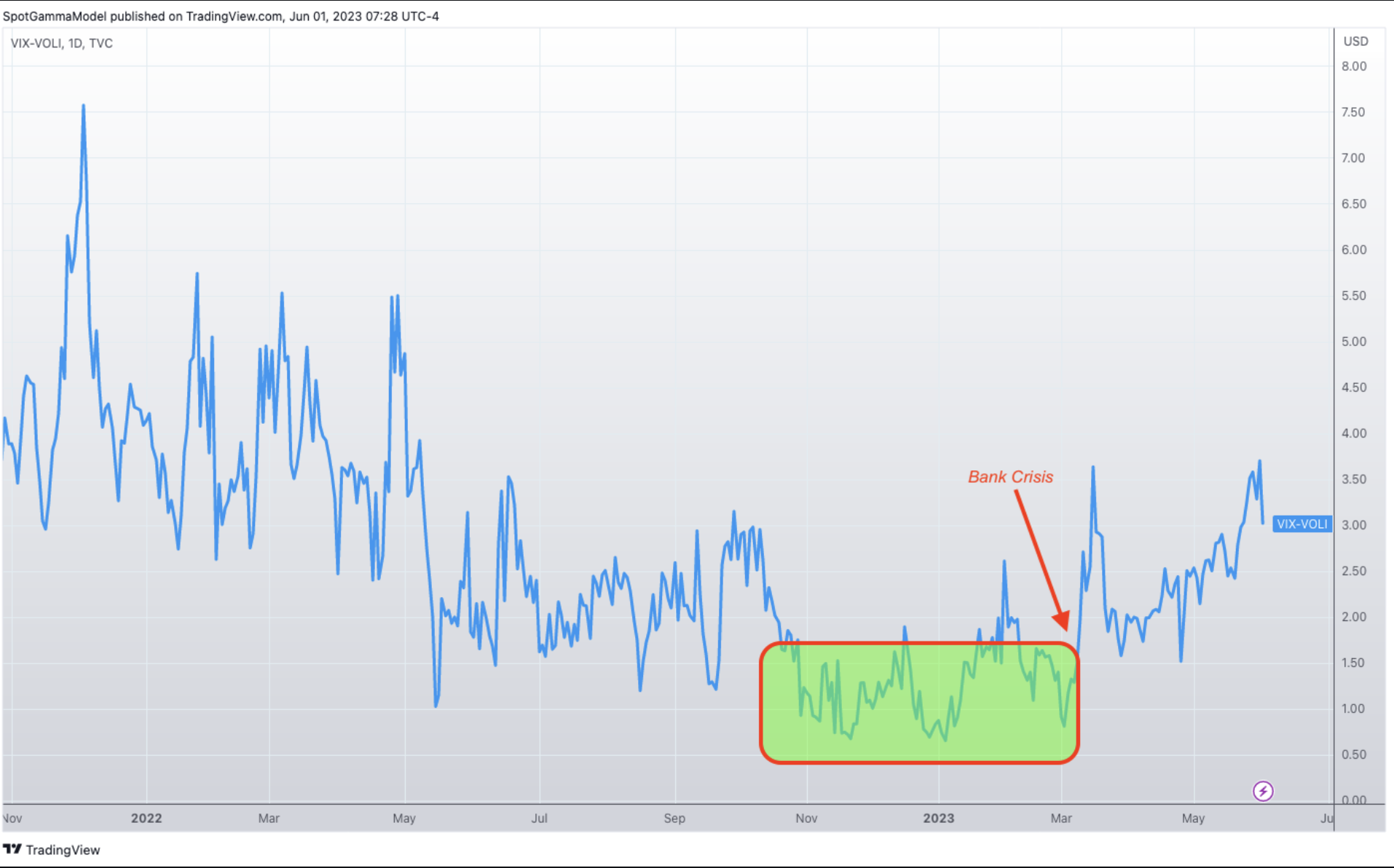 Even though those ATM IV’s are tight to RV (or even below), downside skew may still have to come down which is likely what the vanna model is picking up. The elevated skew is suggested through the VIX – VOLI indicator, as the VIX incorporates OTM options prices whereas VOLI simply measures ATM SPY IV. As you can see this metric was materially lower from late ’22 and into the March bank crisis (back when tail risk was particularly out of style).