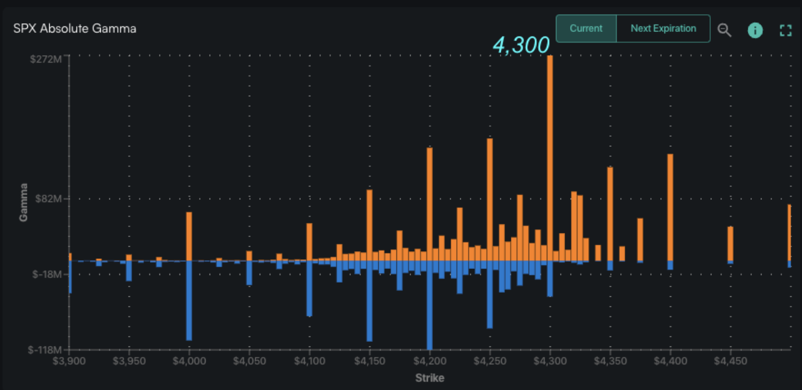 While levels did not change, the 4,300 Call Wall level picked up in gamma size, likely increasing its resistance/stickiness.