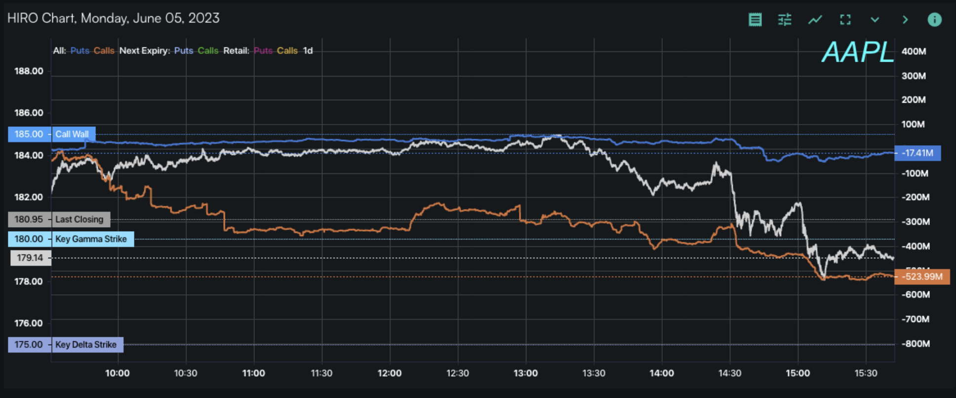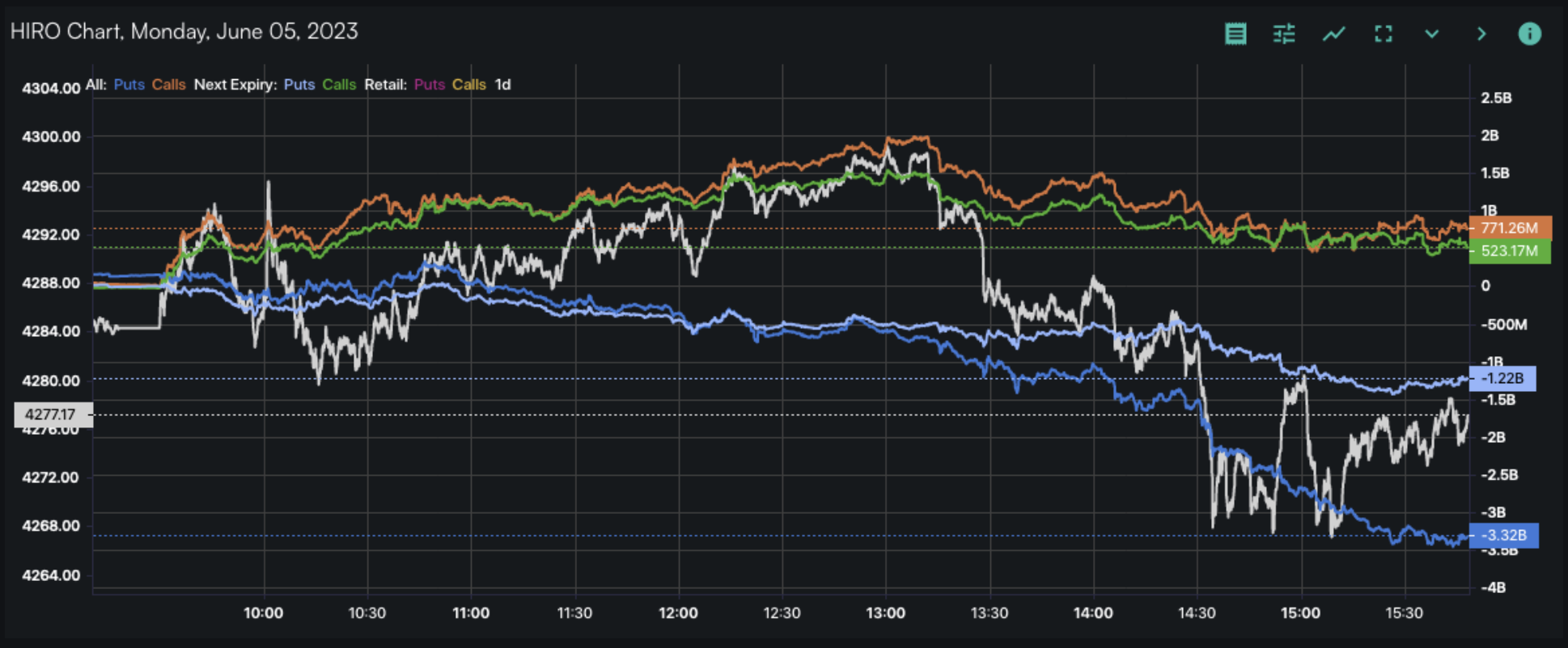Initially, as per HIRO, it was call sellers that came in on the test of 4,300 (all exp call delta flow = orange, 0DTE call flow = green). However, the data reflected longer dated put buyers accelerating into the afternoon. This is implied through the dark blue “all exp” put line being materially beneath that of the light blue “0DTE puts”.