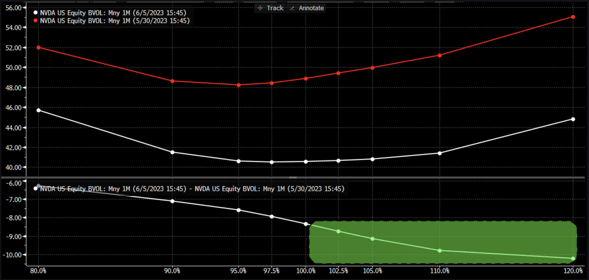 With this, many of the AI names have lost momentum, and that ultra-high IV (particularly call skew) is burning up. As an example you can see NVDA’s skew below, with today’s IV significantly under that of 1 week ago (red) – while the stock price was essentially flat over this period. The green box highlights that it was upside strikes which were asymmetrically bid up during the chase, and are now those are call IV’s are dropping hard. We do think that a lot of volatility players enter these names to short IV when its so explosive, and those dynamic hedgers may help to support the stocks price while (or despite) the IV comes down.