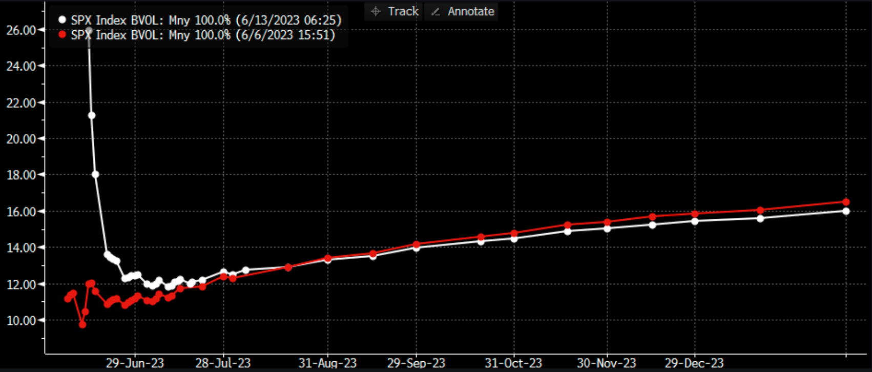 While this AM’s CPI is dominating discussions, implied volatility is various shades of unconcerned. On one had we have todays 0DTE SPX straddle trading at $32 (ref 4340, IV 28%), which is a CPI-day low since Jan ’22 (per GS, h/t ZH). On the other side that implied volatility is higher than it was one week ago as ATM IV has shifted from 11% to… 12% (looking out past the noise of the next few sessions).