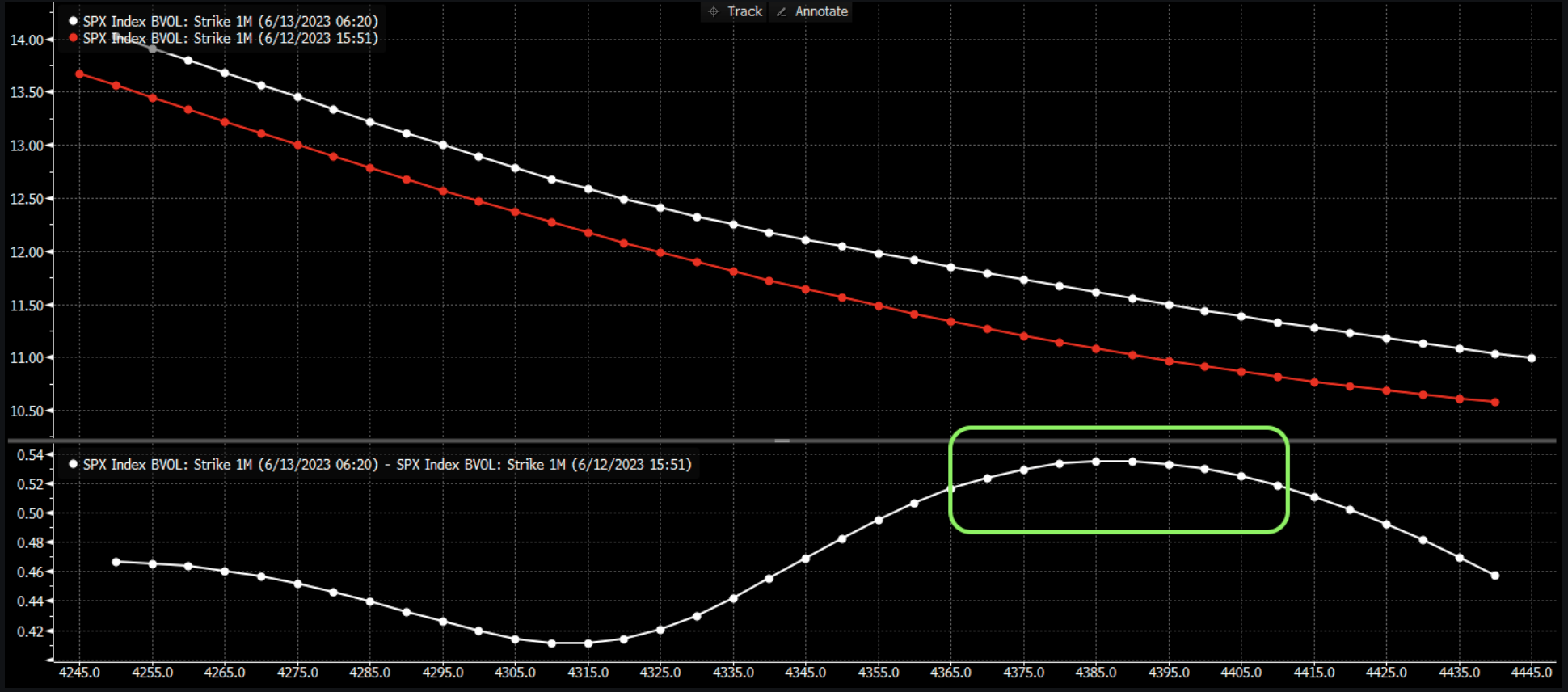 If you dive in, what you see is that IV is asymmetrically bid for upside strikes, as shown in the fixed strike IV plot below. This is shown through the 1 month strikes >=4,365 having higher relative IV’s on a week over week basis. Through this IV lens one could argue that the positioning reflects a concern for missing further upside.