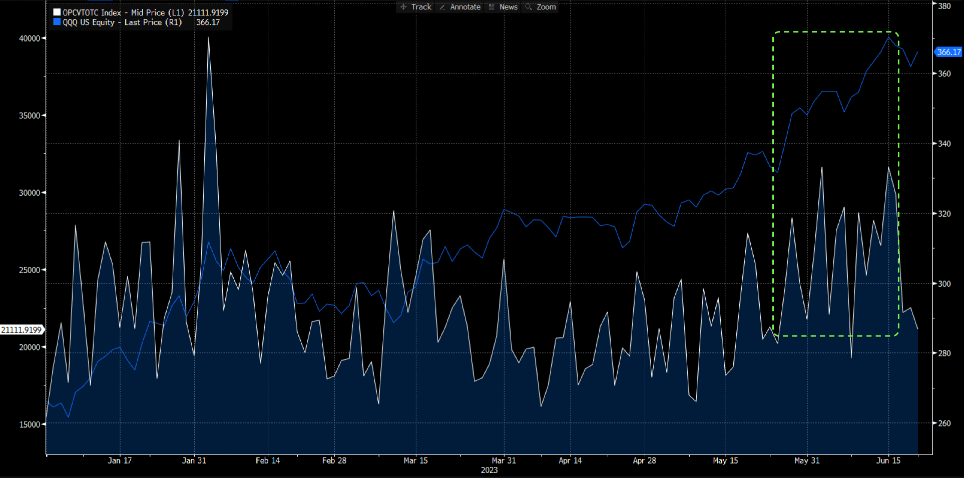 On this topic call volumes were relatively light the last several days, and should that volume ignite it may bring another shift higher in top tech. Below you can see how many of the recent surges in QQQ (blue) were tied to jumps higher in call volumes (white).