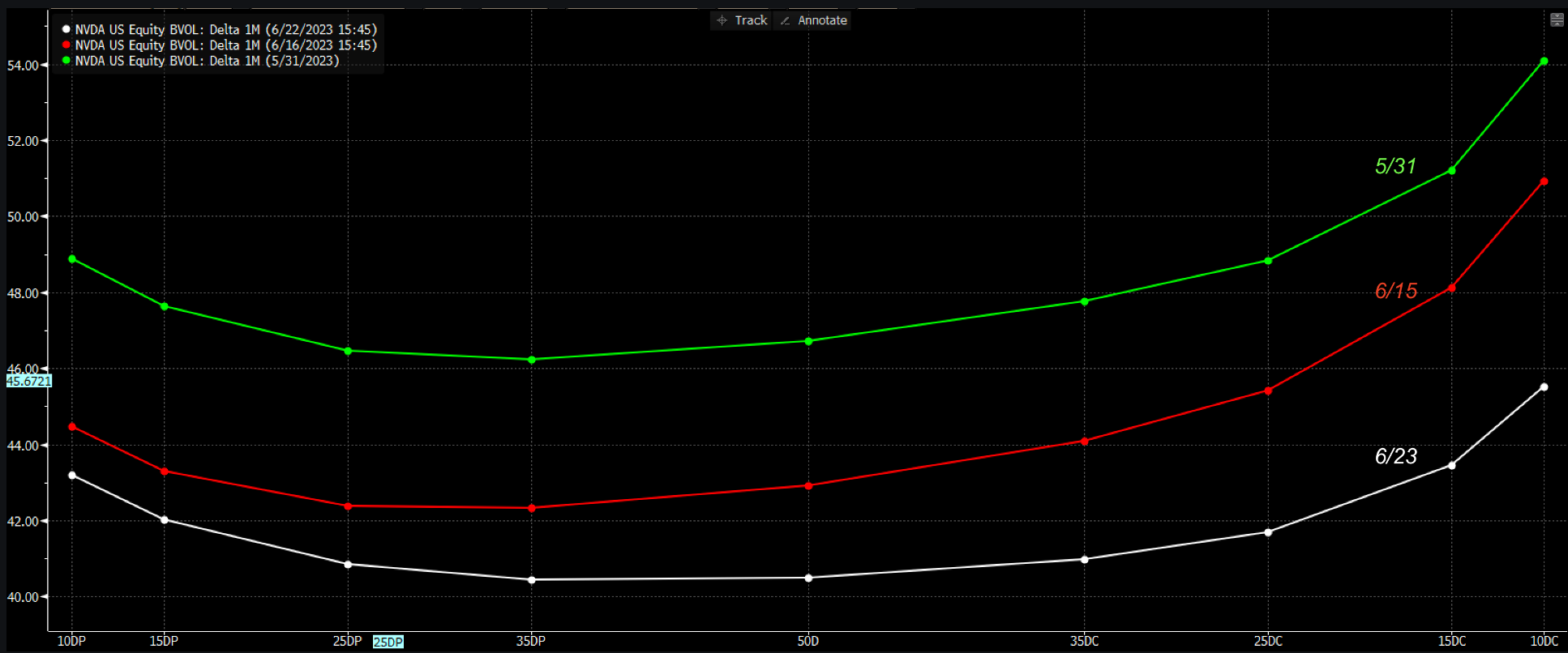 As another example we have NVDA skew below, wherein you can see call IVs & skews have certainly come down. This still looks a bit rich to us, but its clearly off recent extremes. We surmise that many investors that missed the first AI rush were left looking for better entry points, and so they may start to find those now.