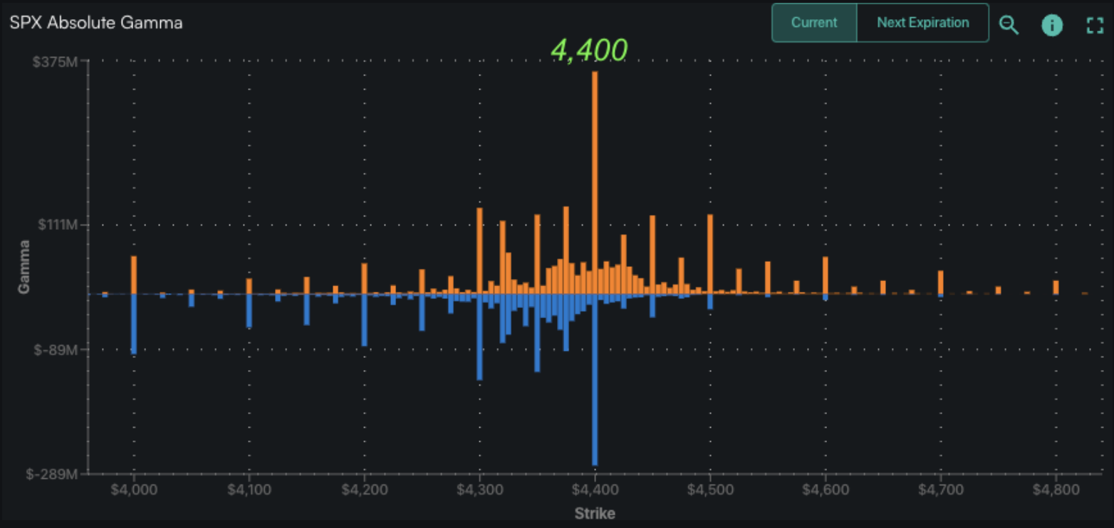Shown below is gamma by strike, with calls in orange and puts in blue. As you can see, 4,400 is “a beast” and a level we think should act as resistance for today. If/when the S&P closes above this level it should offer strong support.