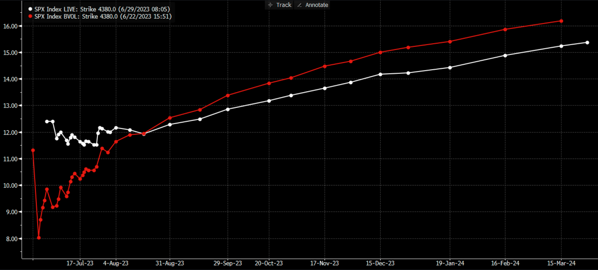 From our perspective, the conditions for options hedging flows to drive downside volatility are not in place unless the S&P500 breaks 4,300 which is our major support level into tomorrow. While that level is currently ~1.5% away, we remain on watch for volatility due to tomorrows quarter end flows (JPM collar, equity rebalances).