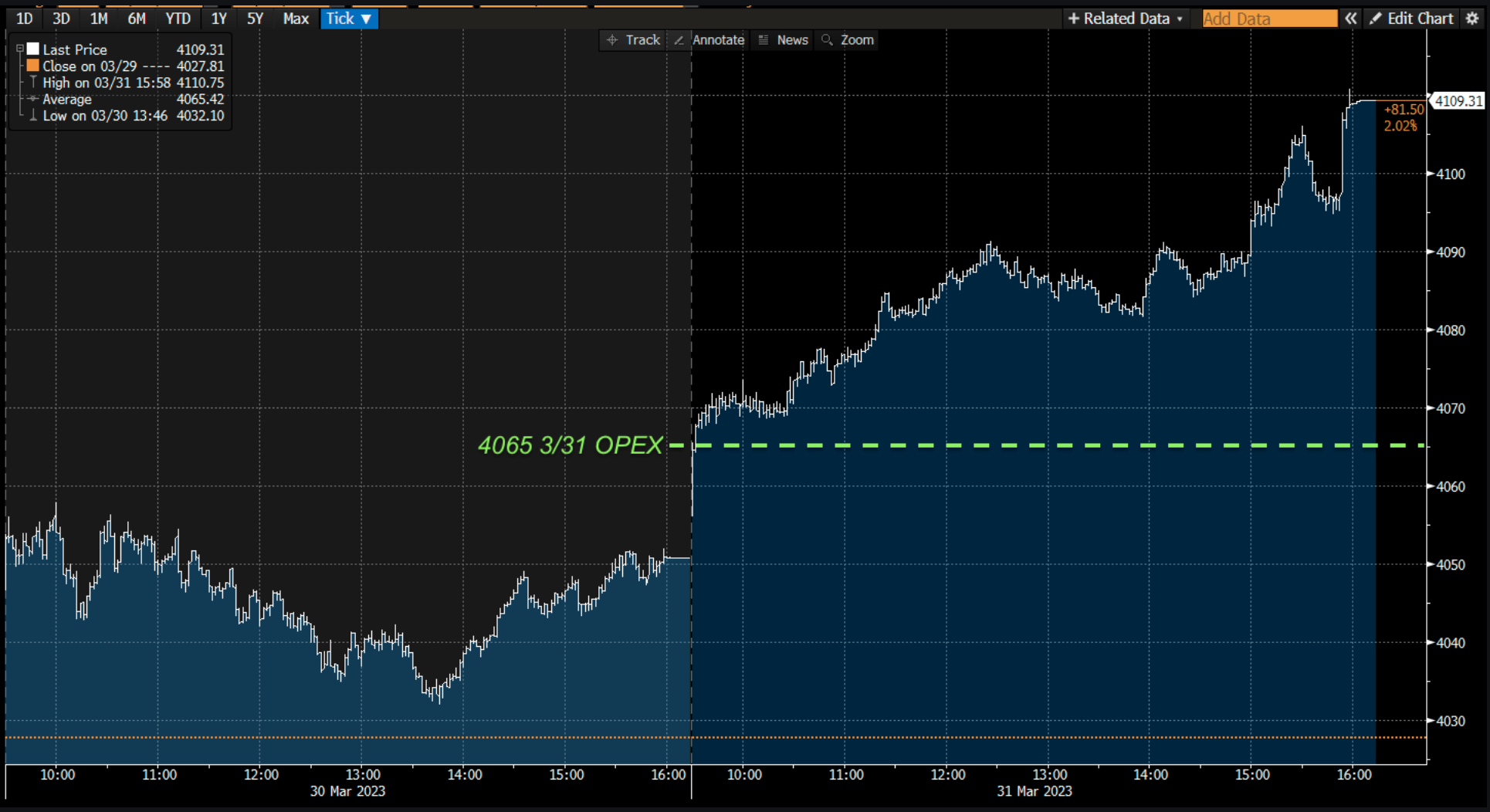 Some large flows apparently unlock today, which may include (as GS & JPM allege) large equity rebalances, but also the JPM collar roll. As a reminder, the short strike for the collar was 4065 in March, and the market blasted through that on 3/31 (plotted below).
