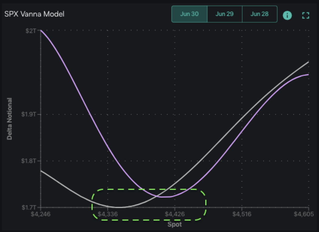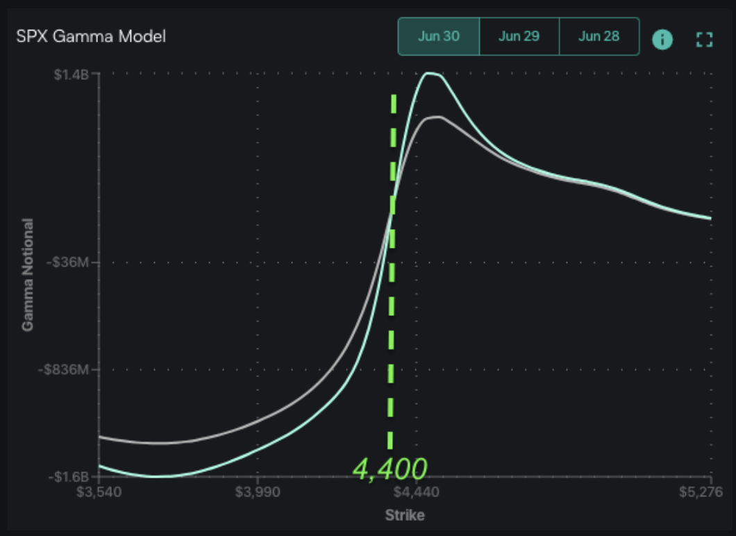 Lastly, backing this idea of reduced volatility is gamma, which is materially positive >=4,400, as shown below. It peaks into 4,450 which is the likely Call Wall for next week. Should we rally higher, then volatility should reduce in kind.