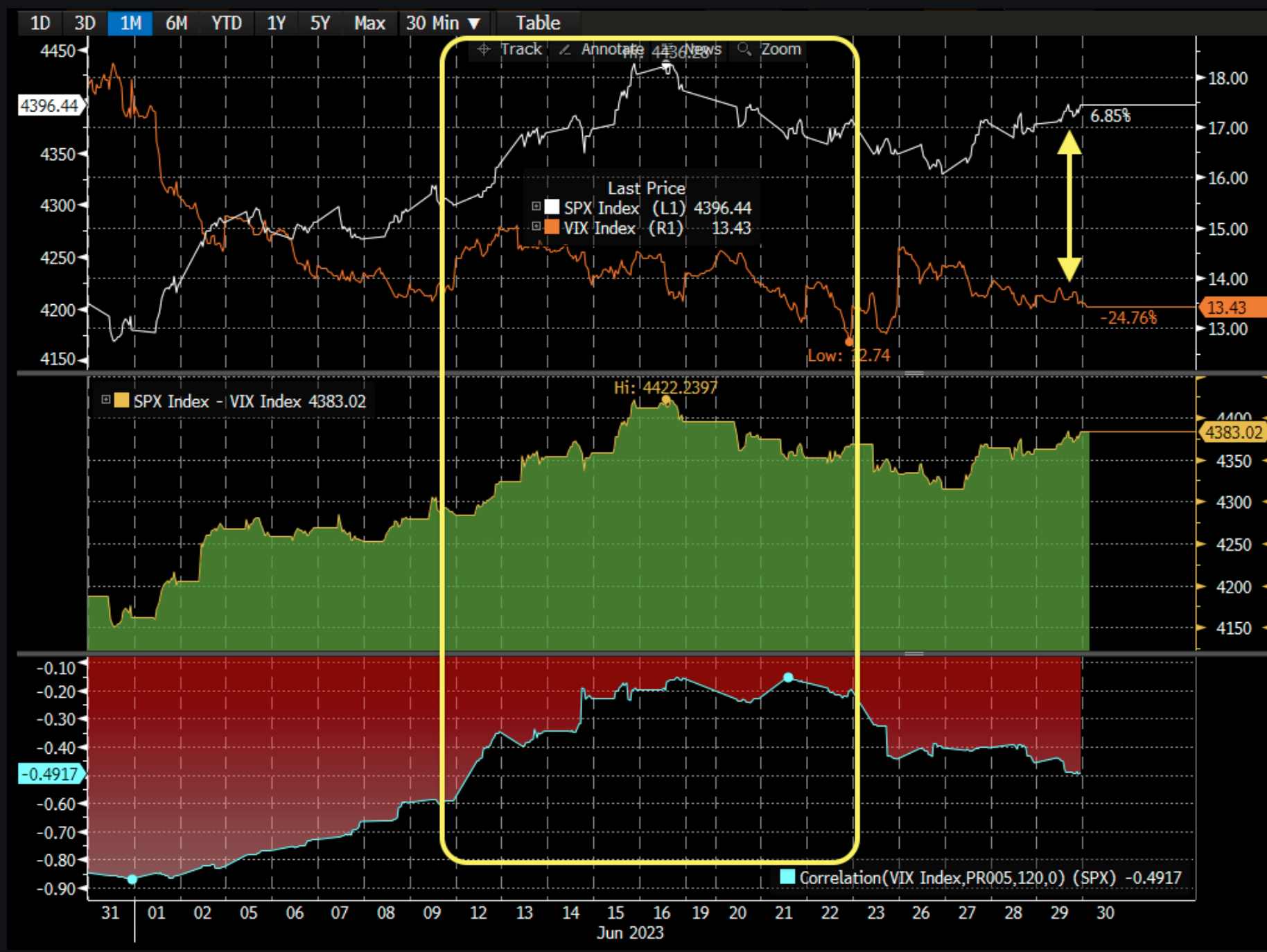 Adding to this, in yesterdays AM note we discussed the decline of rich call IV’s, which may draw equity buyers back in. In line with this “call deflation” is the relationship between the SPX & VIX, which seems to have returned to normalcy. Throughout the aggressive long call period of early-mid June there was a positive correlation between VIX & SPX due to call buying (SPX up, VIX up), and that correlation remained as those long equity calls cooled off, leading to “SPX down, VIX down”.