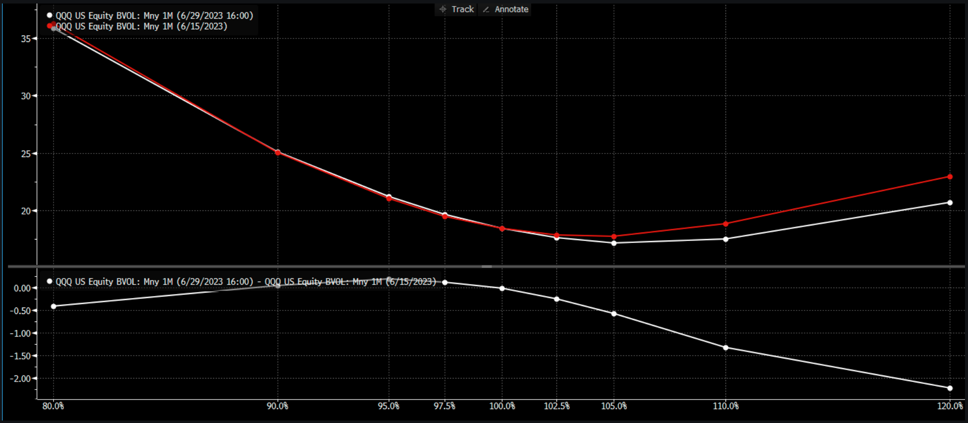 We can frame this lower call IV through skew, too. Shown below is QQQ, and you can see that upside strikes have a lower IV than that of 6/15 which is when we ran into SPX highs on OPEX day. For the record – this looks the same through a fixed strike lens, too (i.e. lower vols).