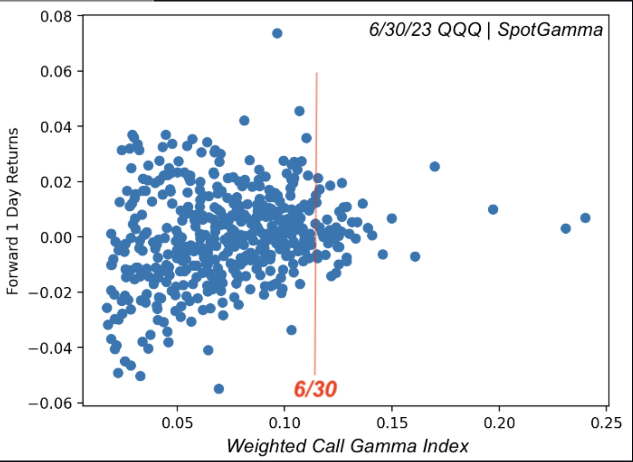 If you look at one of our proprietary gamma measurements you can see a relationship between the gamma position and lower volatility. Shown below is QQQ, with todays reading marked in red.