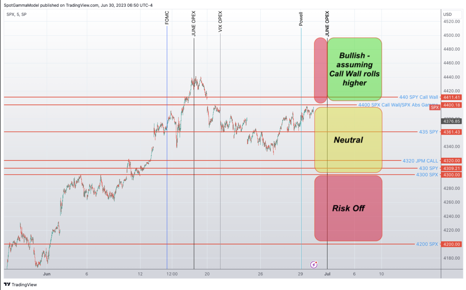 In summary we remain bullish of equities if the S&P closes above 4,400, with volatility continuing to reduce. While 4,400 is our Call Wall for today, we feel rather confident that Wall rolls higher for next week.
