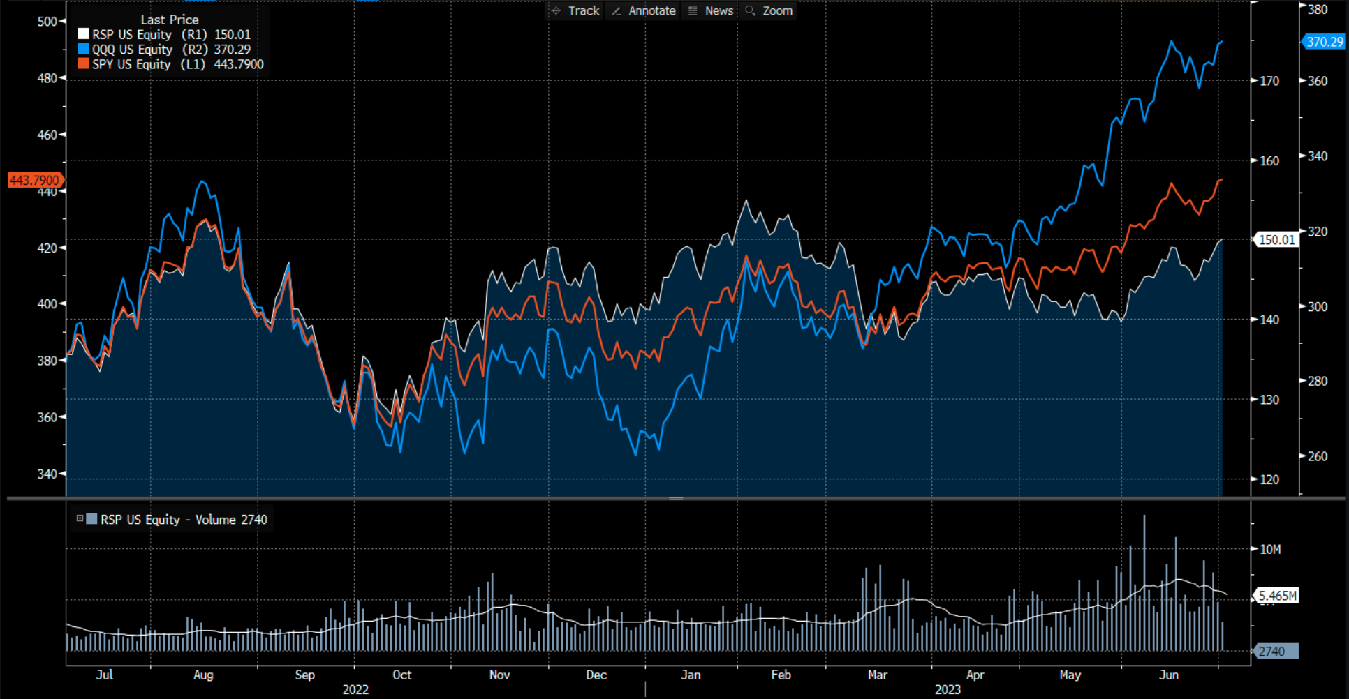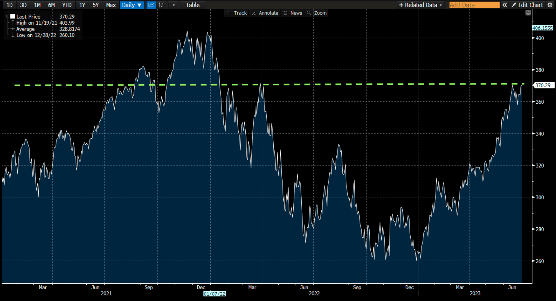 While the setup in SPX seems clear, the dynamic in QQQ is a bit more interesting. As we discussed on Monday, there was a big seller on Friday which stuffed the Q’s at 370 – and this level was rejected again on Monday. This was an area that provided major resistance in early ’22 as shown below.