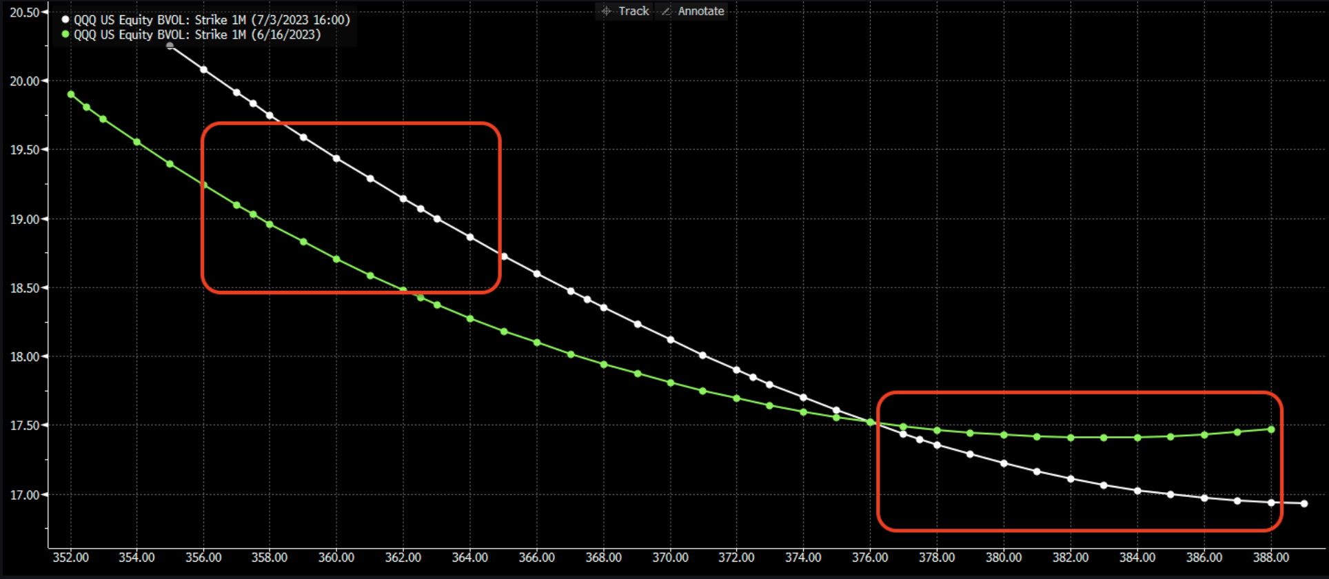 The most recent time this 370 area was tested was on June 16th OPEX, which was a major peak in call implied vol’s. Below we’ve plotted fixed strike IV’s below for 6/16 (green) vs today (white). While those same 370 area, 6/16 QQQ highs were being retested Monday, you can see that the upside strike IV is quite a bit lower (right red box). Further, we see that downside currently has a larger bid, too (left red box). Through this lens there is less relative upside demand with QQQ at these highs.