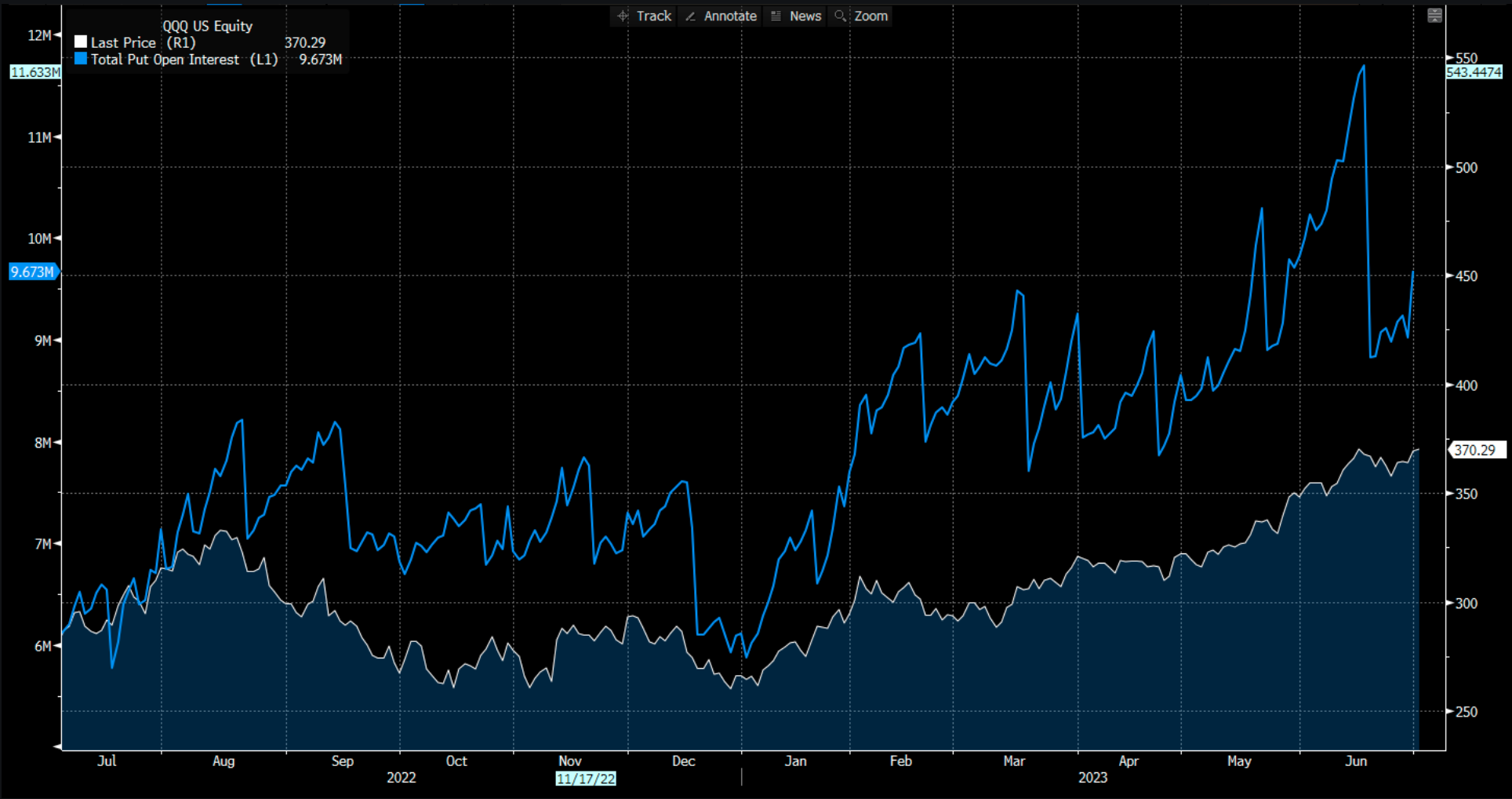 From an put open interest perspective, much of the QQQ put position (blue) was wiped out on that June 16th expiration. Put interest has increased higher over the last few sessions, and based on the put skew we believe much of this is long put buyers. We don’t have a handle on if these put buyers are re-hedging vs speculative shorts, but taken in context with the 370 area resistance this may be an important juncture for QQQ.