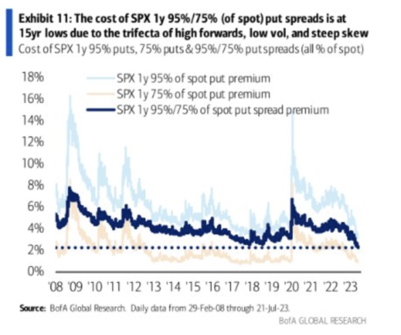As we have been discussing for a few weeks, the market is exhibiting extreme levels of complacency. This is a theme now being echoed by the banks, too. The chart below comes from a BofA piece, wherein they note that 1 year 95% SPX, and 1 year 95% – 75% put spreads are the cheapest they’ve seen since 2008 (when their data began).