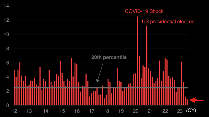 While the metric above is around long dated puts, the short term estimated event volatility has plummeted, too. Shown here is the “SPX 1 week implied volatility skew” around FOMC days (h/t TME), and as you can see it rivals depths not seen since ’17 (a year when the VIX hit all-time lows). Further, today’s 0DTE straddle is pricing a one day SPX move at 66bps (ref: 4560, IV 25%) which is the lowest since Nov ’21 (per Citi).