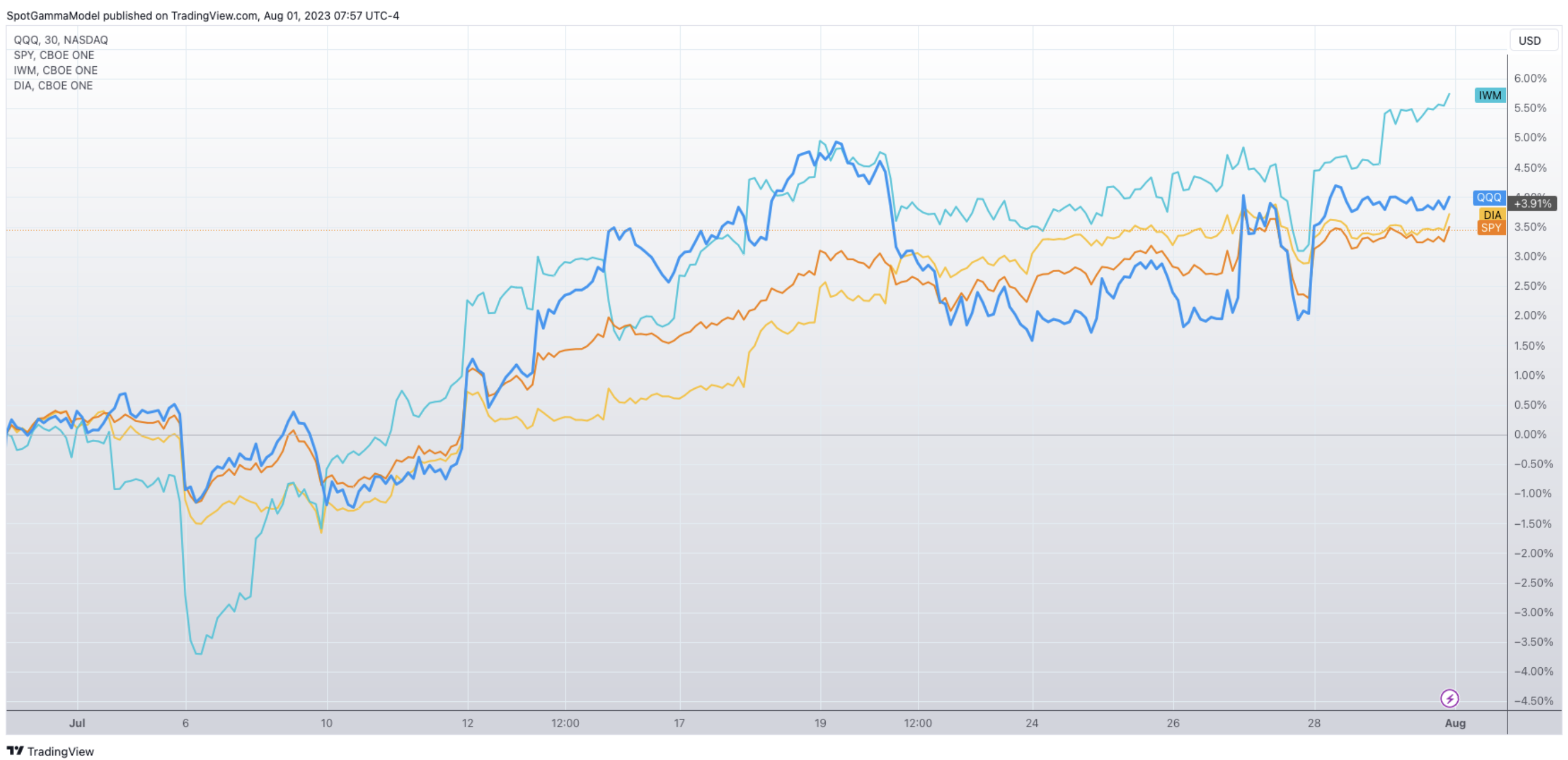 One of the knocks on this years rally was the lack of breadth, and at this point funds are likely fully allocated into their MegaCap Tech/AI positions. In July there was outperformance in IWM, and the DOW/DIA tied a record for consecutive positive sessions (13). Its also interesting to note that both the SPY & QQQ are just 3.5-4% from their all time highs, with the Dow now at its all time high. Focus on the “leaders” seems to be shifting to the “underperformers”.
