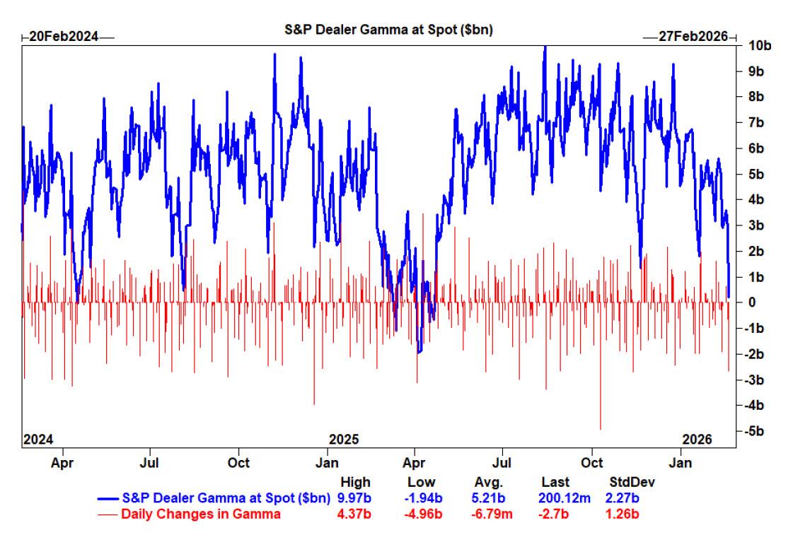 - What’s different here is the dispersion: single stocks are telling a different story relative to index. IF the big single stock positive gamma was being held up by Feb OPEX, then you would think single stock vol would maybe now pick back up, or index vol will increase to sync with single stock vol.