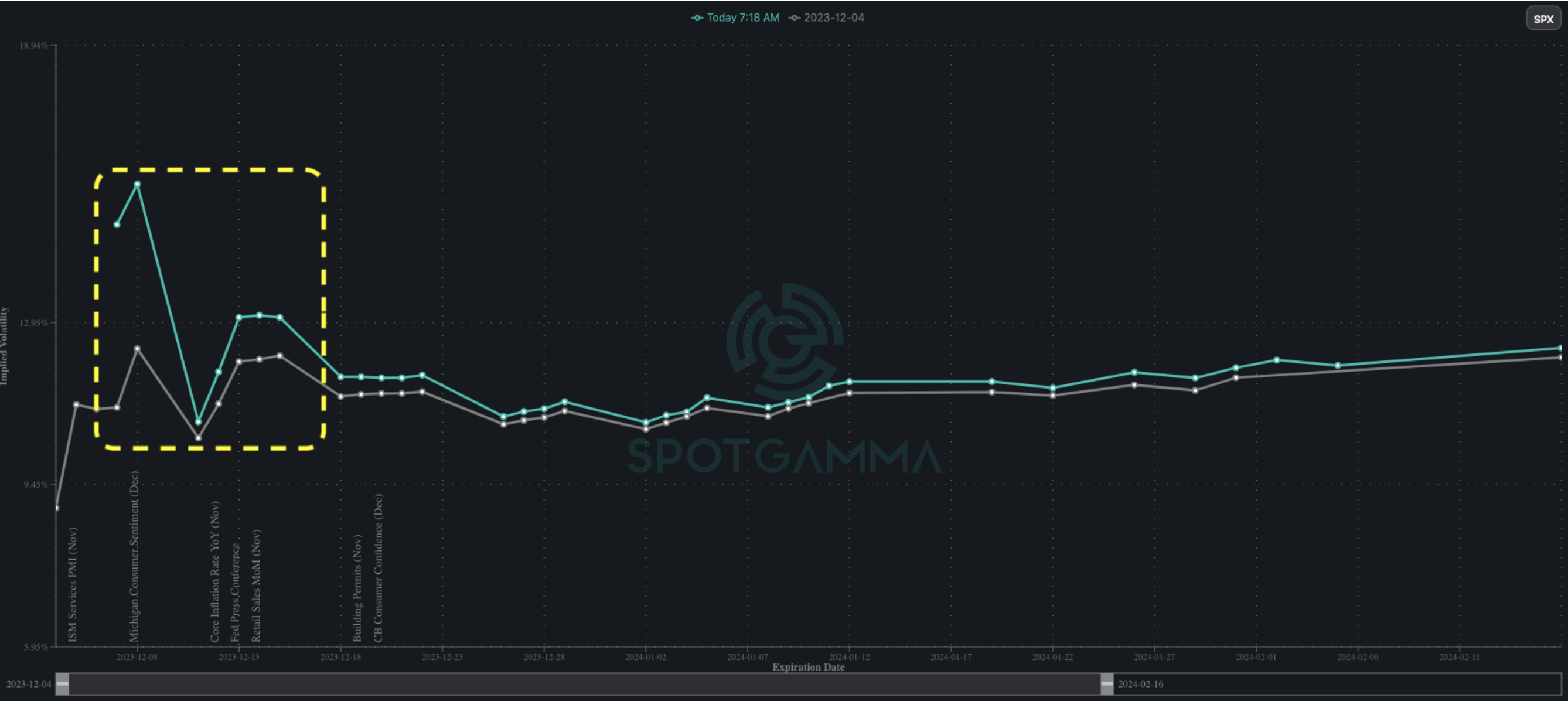 Note, though, how low IV is for expiration >= January at ~11.5%. This suggests traders are pricing in some noise around data next week – but see very little risk out in time.