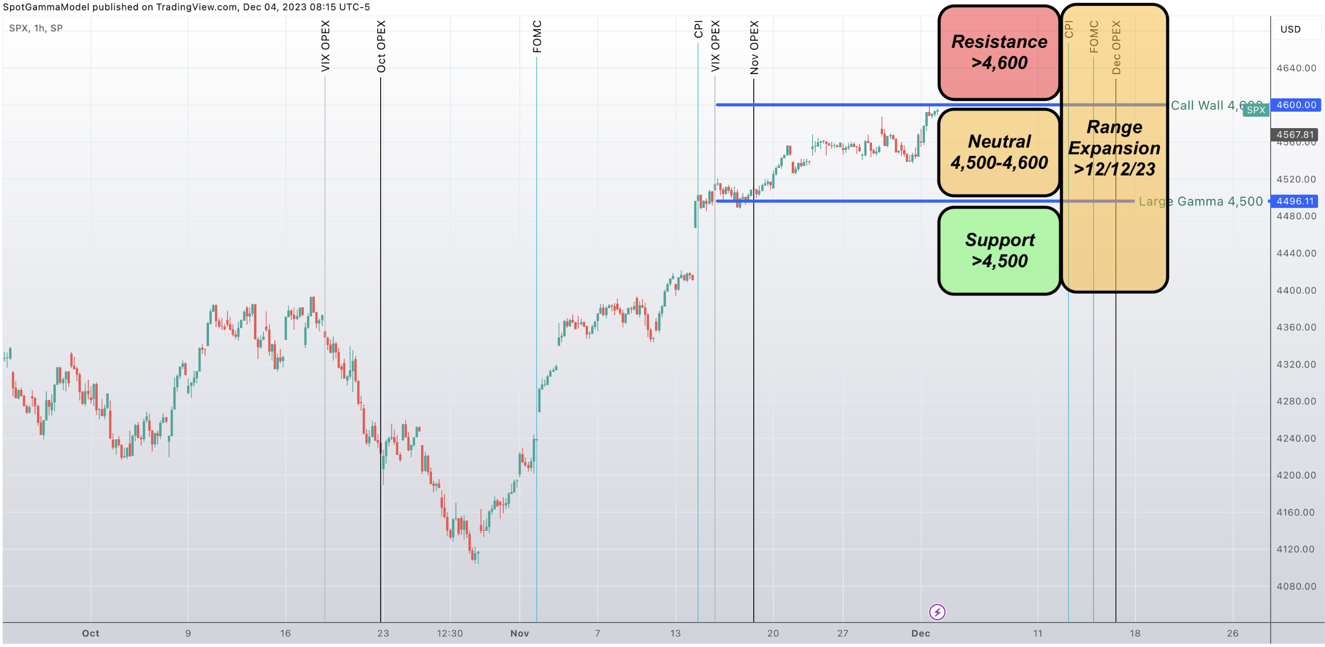Tomorrow is NFP, which has the potential to shake things up. However, any move plays into a weekend, followed by a light data-day on Monday. This signals to us that unless the NFP is a major deviation, we’re unlikely to shift out of this 4,500-4,600 box before Tuesday AM.
