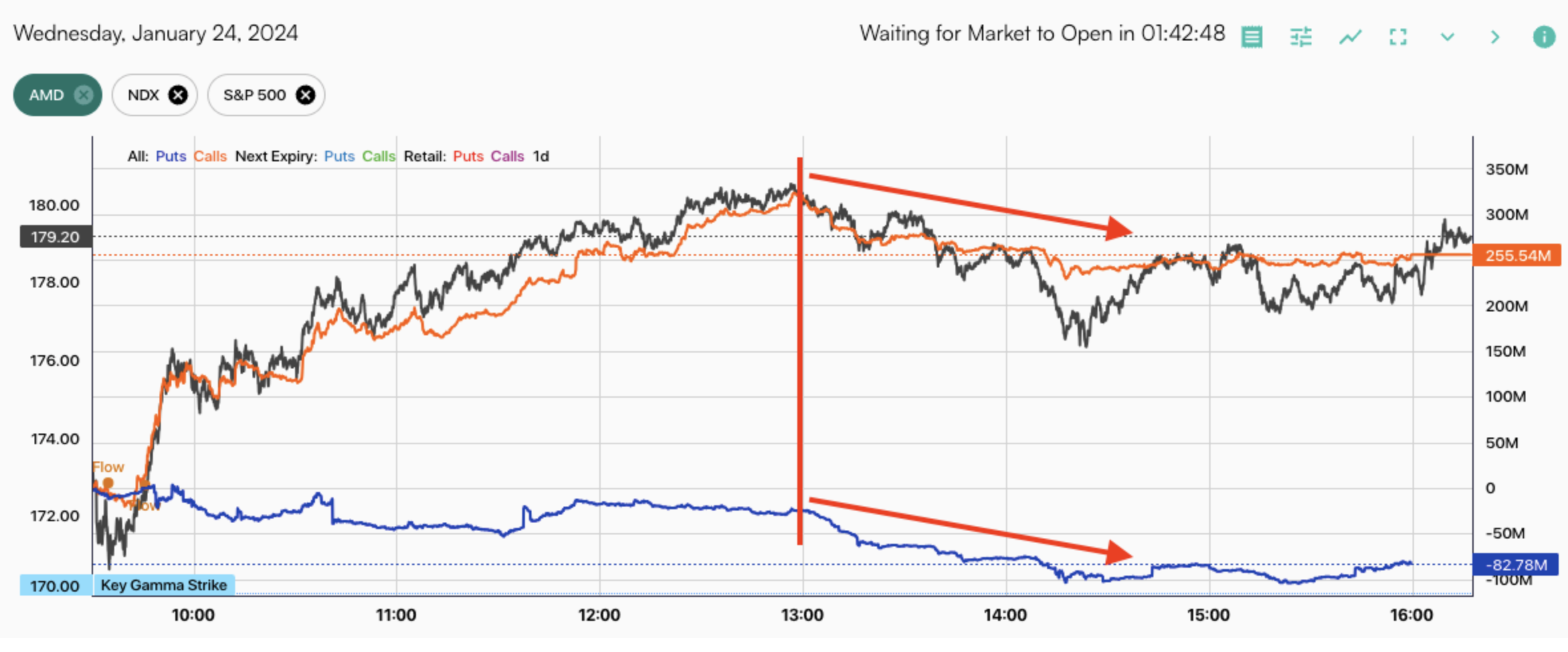 To be clear, as shown with AMD here, this was generally not huge put demand (blue, right of red line) when weighted against the massive AM call buying (orange, left or red line), but it may be a first warning shot that warrants attention.