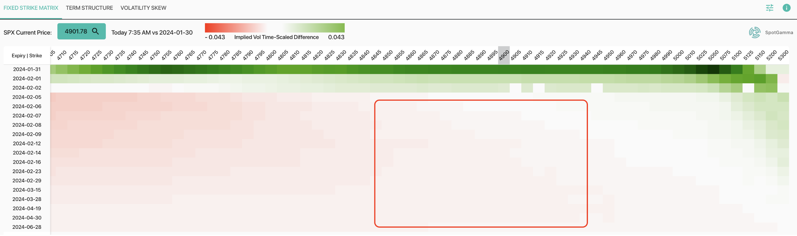 In regards to the overnight action in tech, the best look we have is the SPX implied vols (NDX/QQQ don’t trade in the AM), and, despite futures being lower, fixed strike vols are generally down as you can see in the red zone below. Yes, today’s & tomorrows expiration IV’s are higher, but that would generally happen on an FOMC day regardless of weak tech earnings. Through this lens we view the overnight NQ/ES futures action as some overbought consolidation.