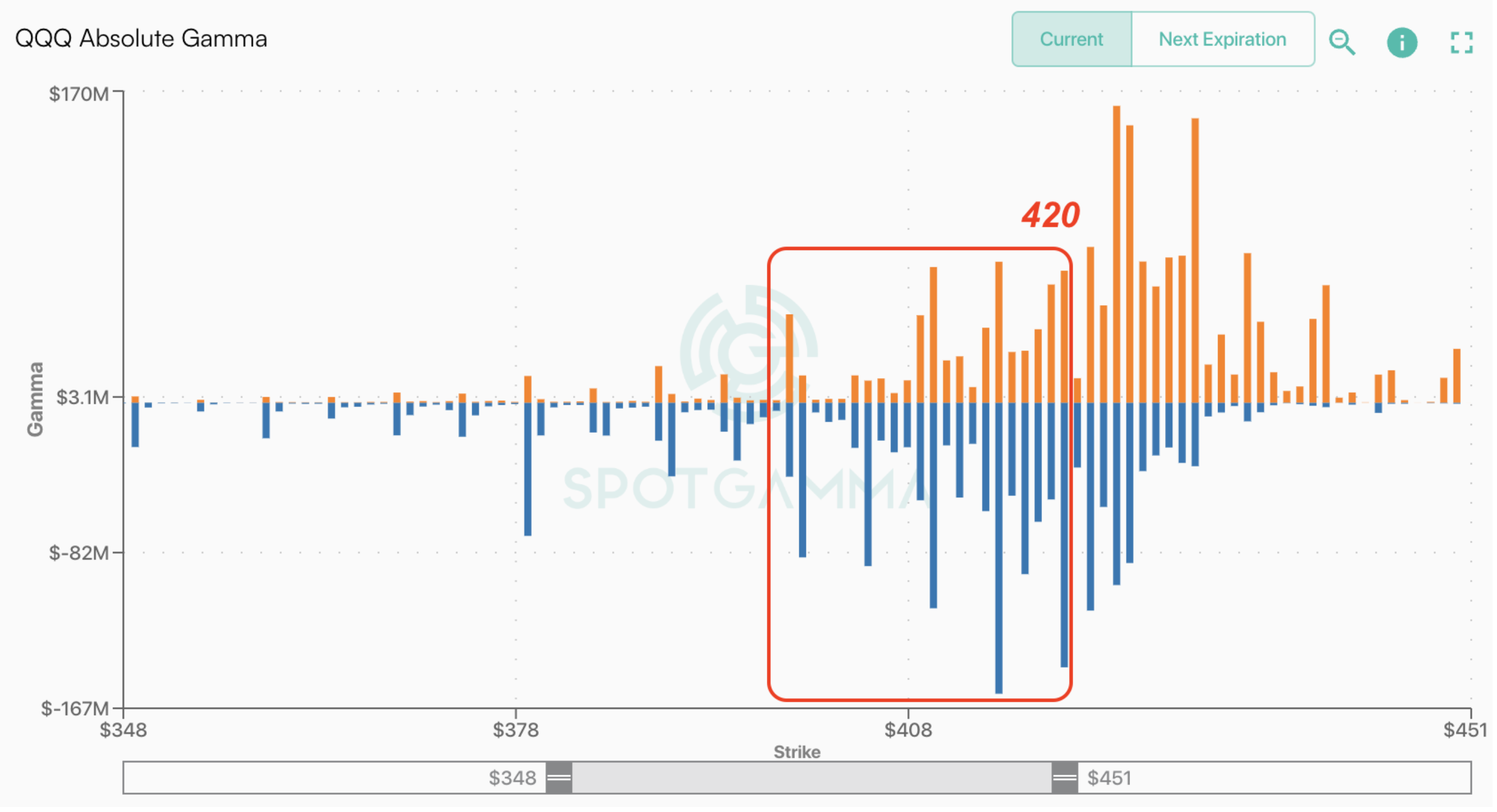 The SPX is indicating an opening near the major 4,900 gamma strike, with QQQ opening at a 420. Should the QQQ’s slide a bit more, it does appear to be entering a more put-heavy, negative gamma region, as shown below (red box, blue=puts, orange = calls). Said differently, its a slippery downside zone immediately below current QQQ prices.