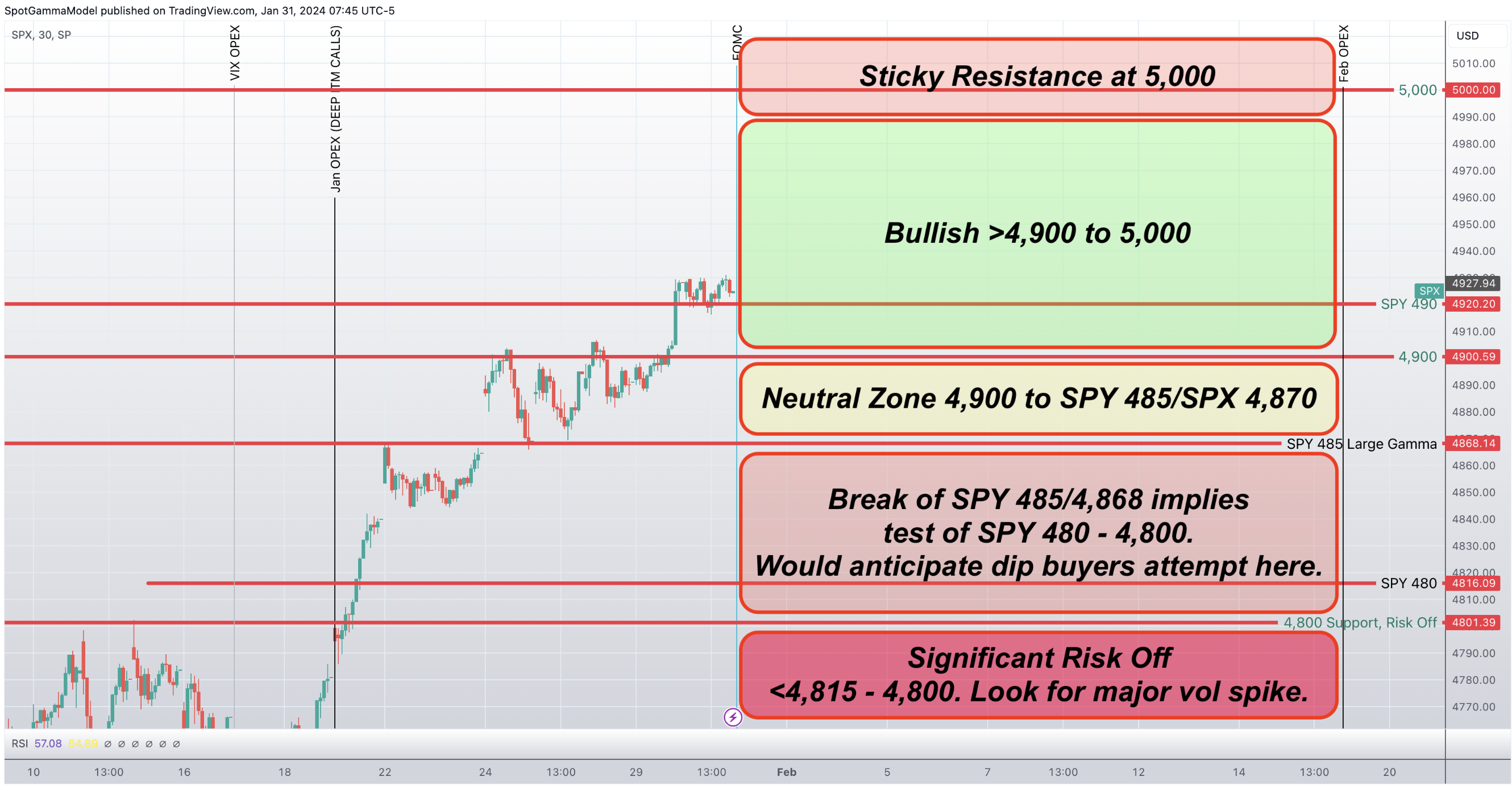 TLDR: We are poised for volatility today, and seem positioned to shift away from current trading ranges, leading to a new set of ranges into Feb OPEX. Major price targets for the 1-2 days post-FOMC: