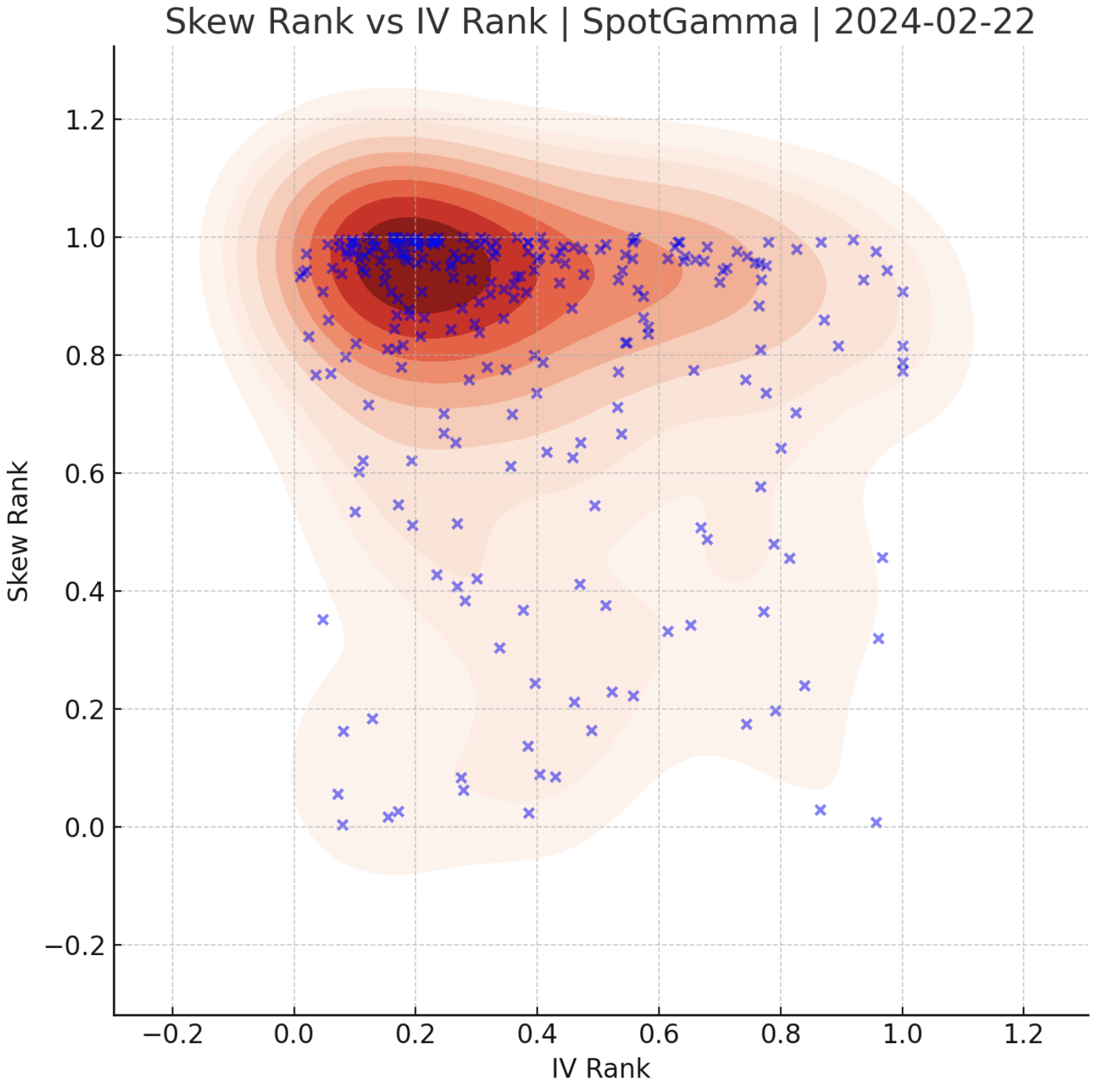 Here we have updated the skew rank vs iv rank plot which shows us that most of the top options-trading stocks have skew rankings (i.e. call values are high relative to puts) in the +90th percentile. This is a crowded bull market, there are no doubts about that, but, you don’t want to fight the flow. To this point these high skews inform us that dealers are likely in a negative gamma position, leaving them to have to chase stocks as they go higher (or sell as stocks go lower), which exacerbates volatility.