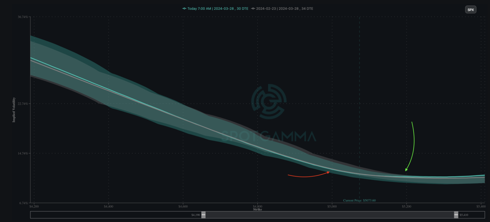 When we zoom out and look at 1-month SPX IV’s we see 1-2% downside protection at 2 month lows (red arrow), and 2% upside at 2 months highs (green arrow). Further, these IV’s are essentially unchanged from Friday’s (gray line) record closing SPX high. The VIX is also down at 13.6, which is two week lows.