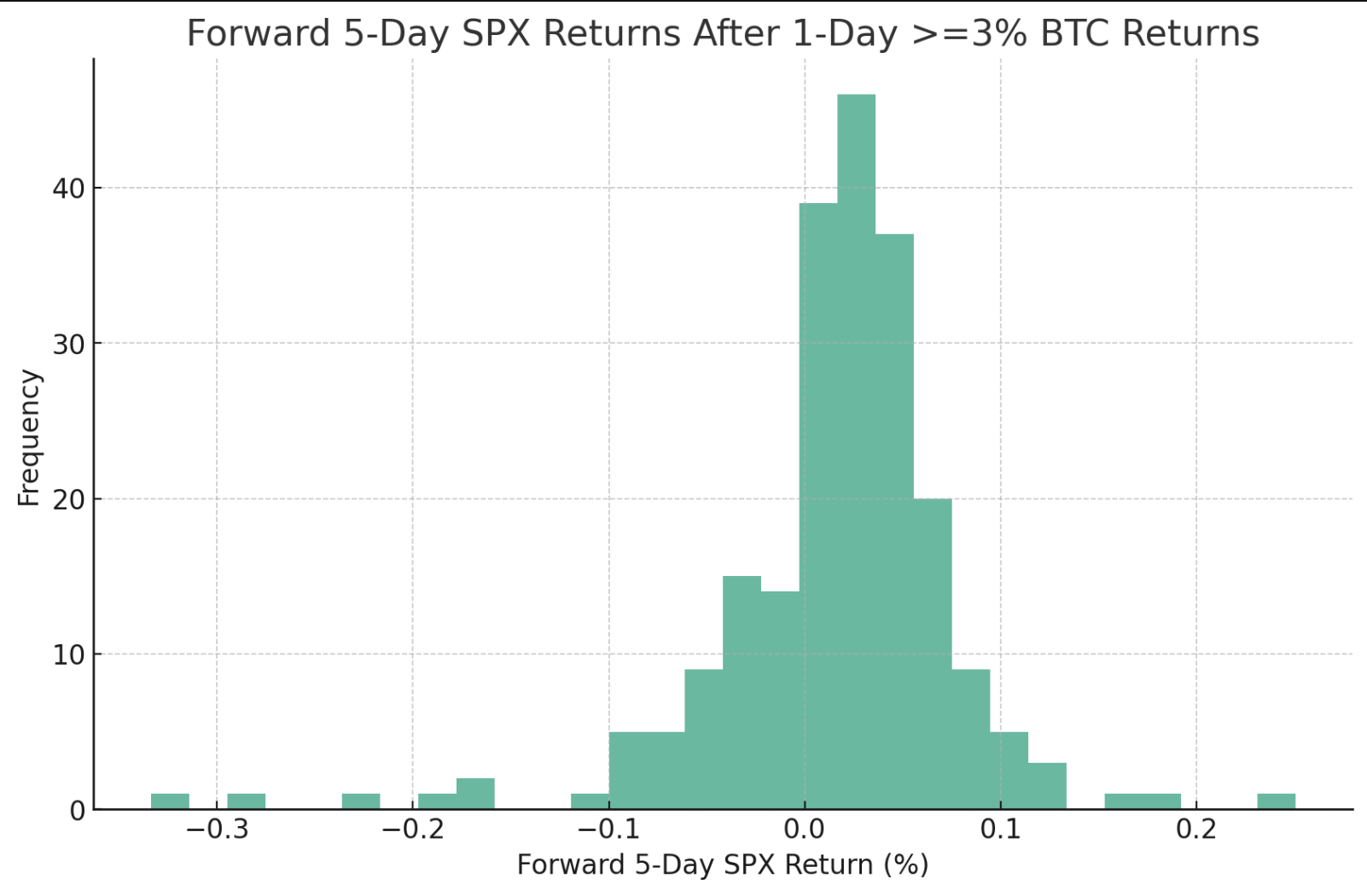 We’ve always thought that crypto performance is a broad measure of speculative sentiment. To test this idea we put together a quick measure of this, showing the forward 5 day SPX returns after 1 day +3% moves in BTC. As you can see, the SPX tends to exhibit positive returns after large jumps higher in BTC.