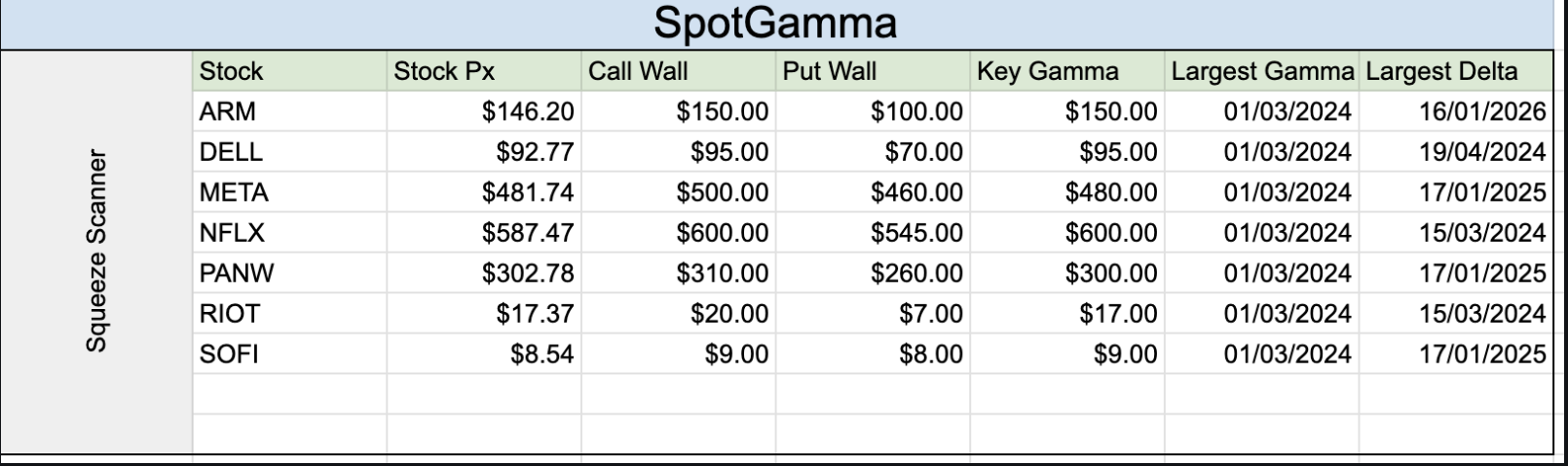 With dull index markets, we again turn to interesting single stock setups. In yesterday’s Q&A the output from our upcoming scanner upgrade was discussed, as the output from today’s squeeze scanner is posted below. These are names that we think may exhibit larger relative upside based on a proprietary blend of indicators. Generally we would use the stocks respective